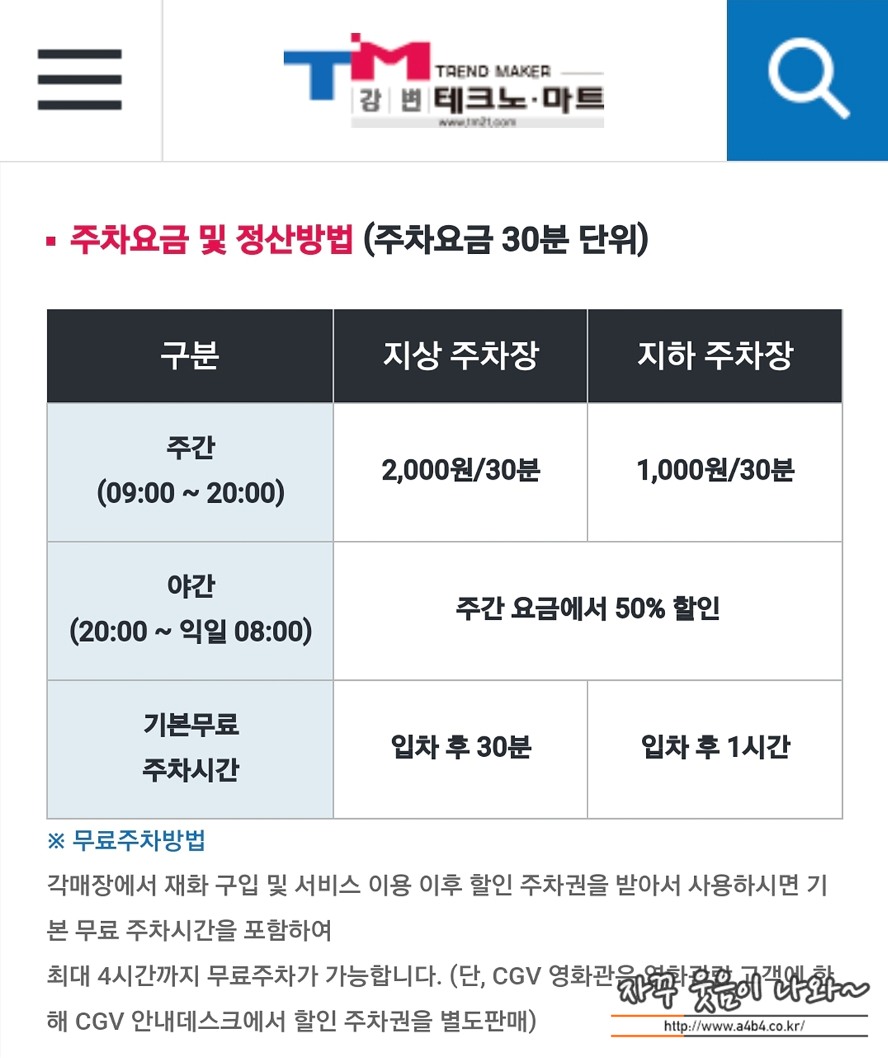 지하 주차장 기준으로 설명 드립니다. 주간 기준 30분 단위로 주차요금이 정산되며, 30분에 1,000원 입니다. 입차후 1시간은 강변 테크노마트 무료주차 가능합니다. 즉 매장을 이용하고 한 시간 무료 주차퀀을 받았다면 2시간 테크노마트 무료주차 가능합니다.