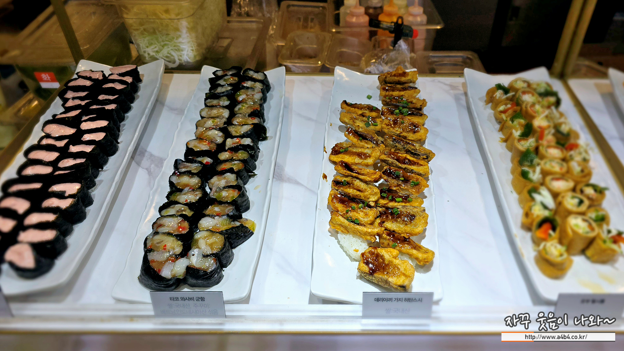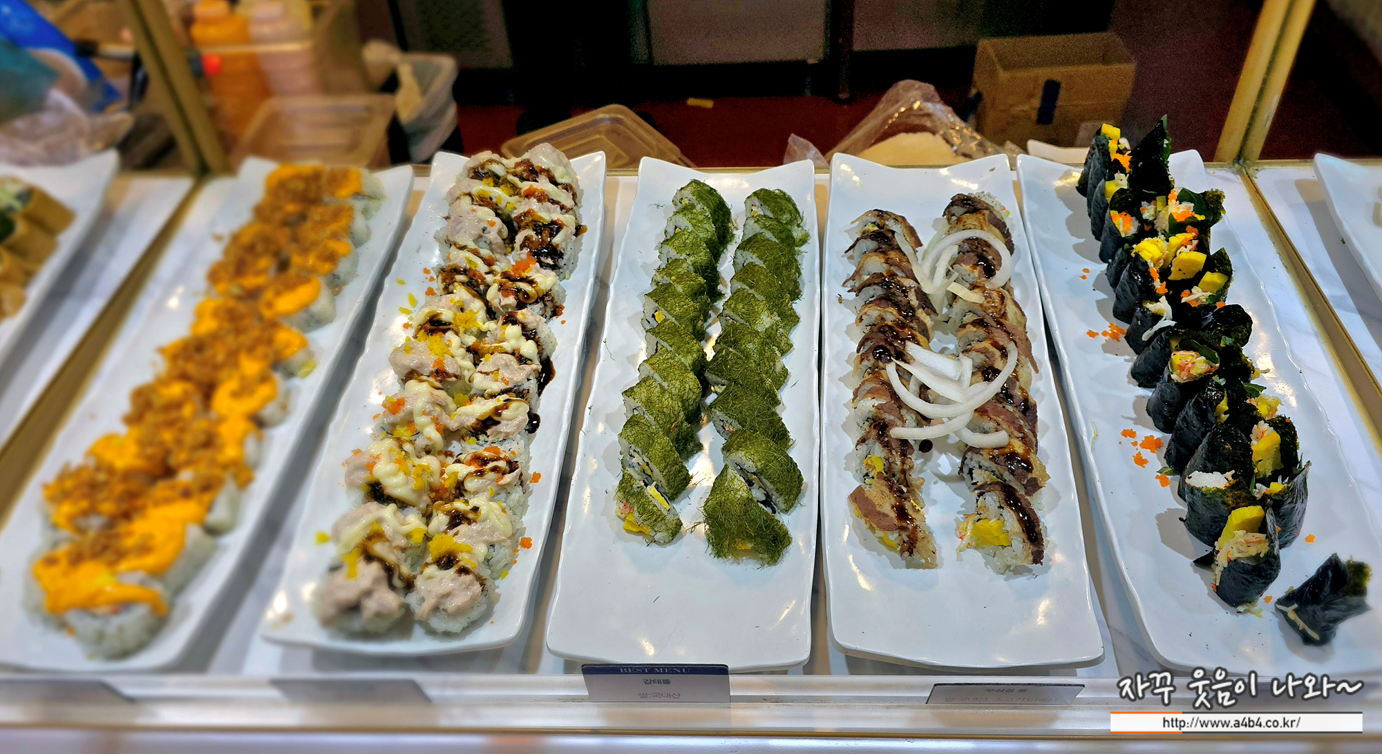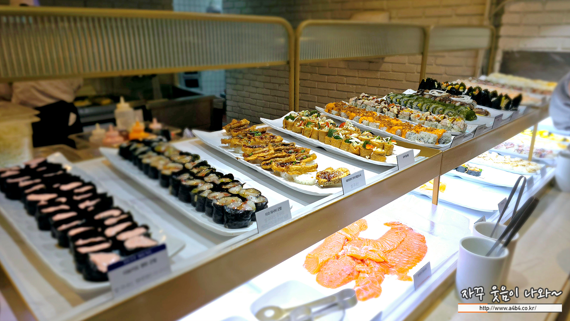 롤과 군함요리가 세팅되어 있습니다. 다 먹자니 배가 터질 것 같고 좋아하는 연어초밥과 롤 한 두개 선택합니다.