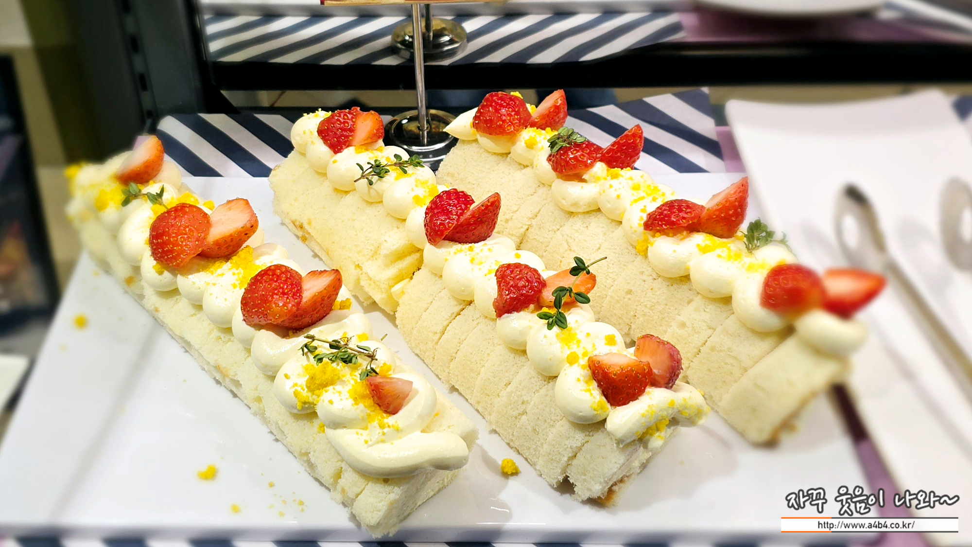 크림듬뿍 달달한 롤케이크 위에 딸기가 올라간 롤케이크 입니다. 부드러운 롤케이크 식감과 상큼한 딸기맛이 잘 어울리네요. 딸기도 싱싱하고...