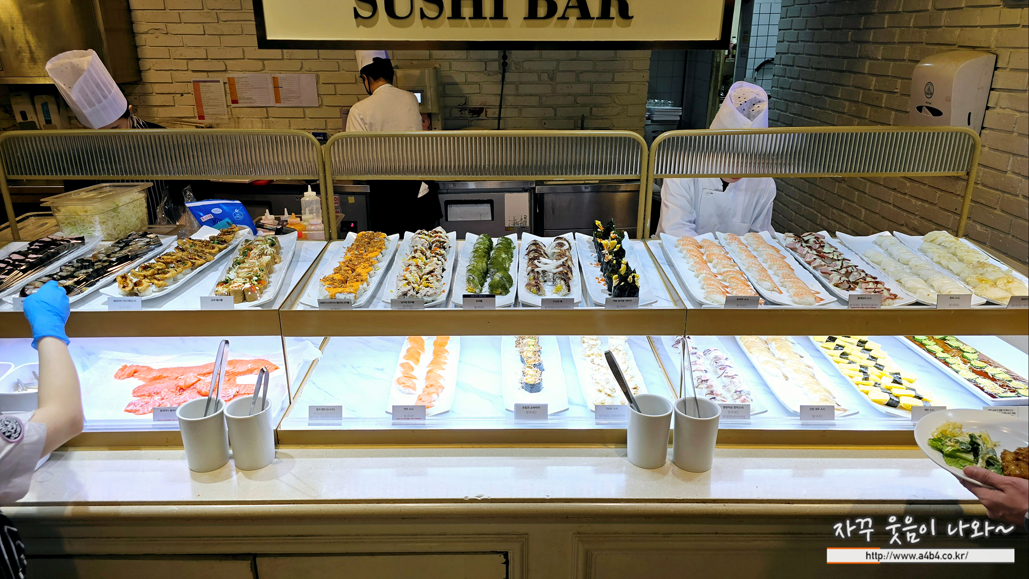 애슐리퀸즈 해산물 코너는 초밥과 롤 중심으로 구성되어 있습니다. 새우초밥, 오리고기 초밥, 묵은지 초밥, 계란초밥등 다양한 초밥들과