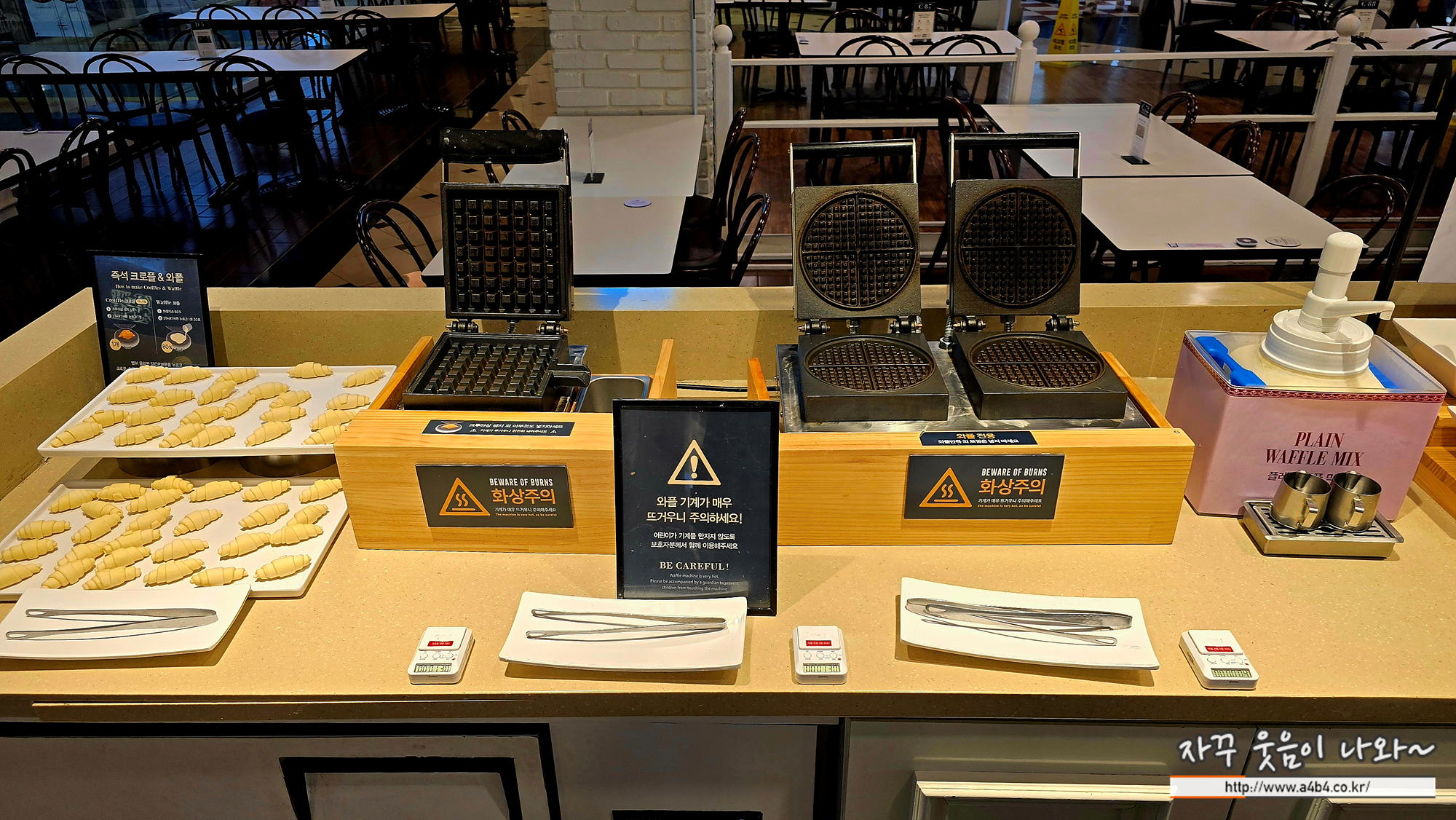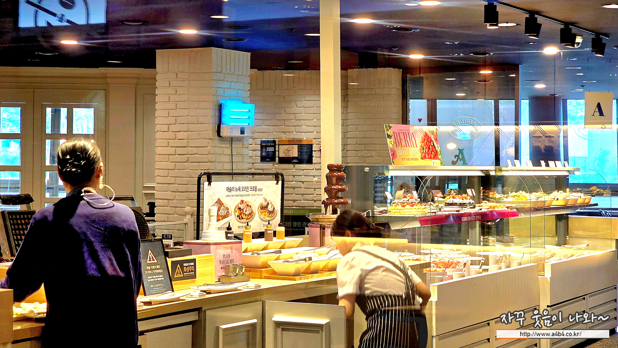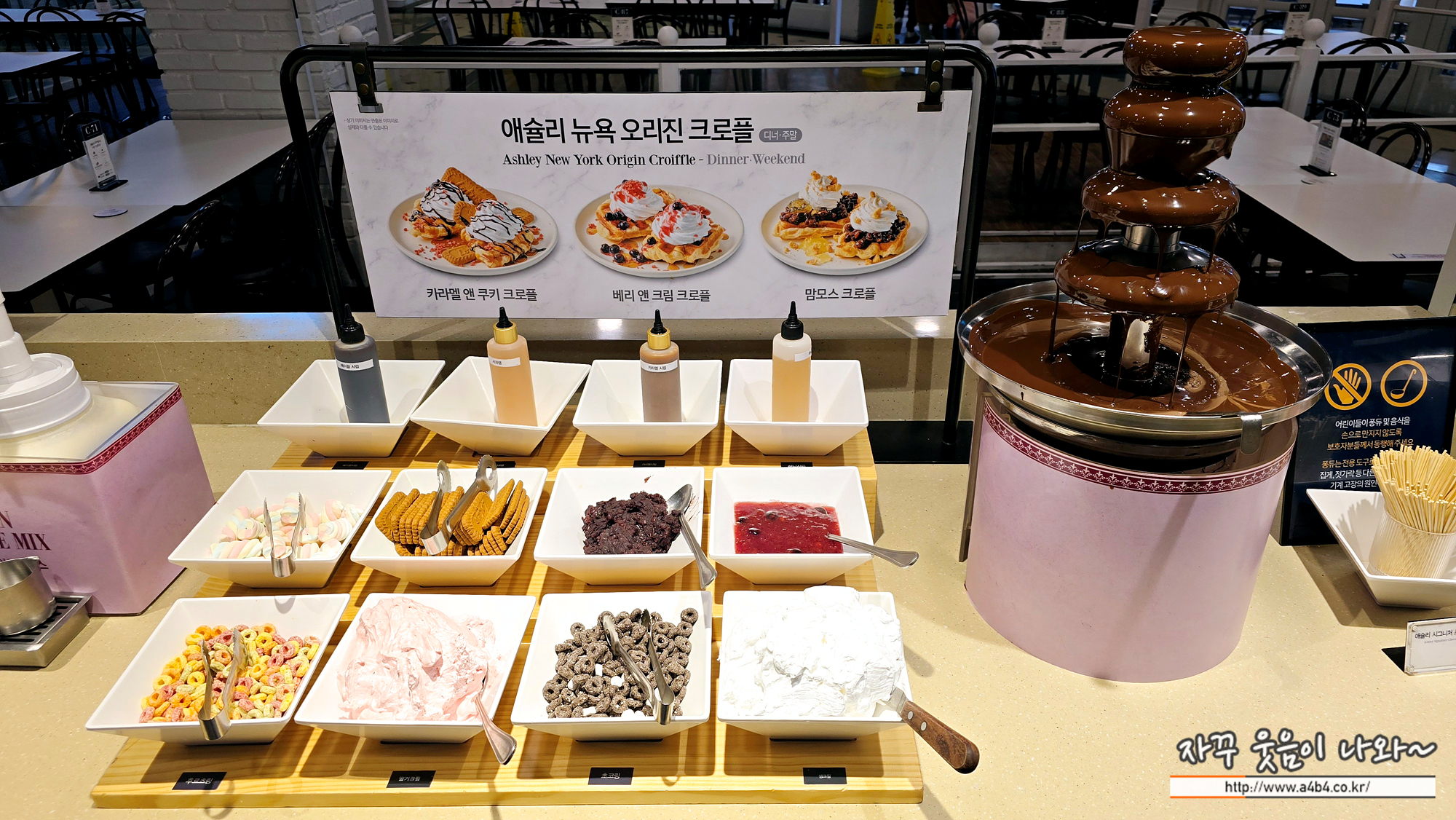 에슐리 딸기축제 옆에는 크로플을 만들수 있는 코너와 초코분수가 있습니다.
