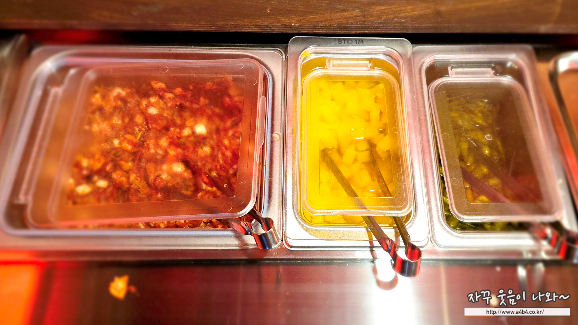 단무지와 할라피뇨와 김치가 준비되어 있고요. 김치는 기본세팅에 같이 나오지 않으니, 김치 좋아하시는 분들은 직접 필요한만큼 가지고 오시면 됩니다.