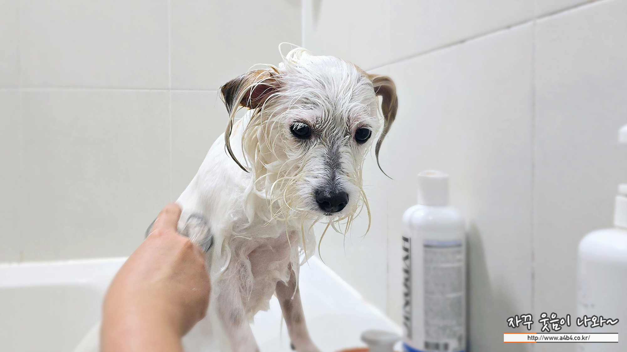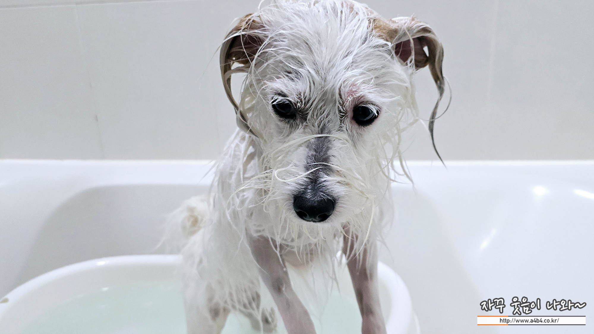 미지근한 물 속에서 얌전히 잘 있고, 강아지 샴푸하고 행구는 과정에서 반항? 없이 얌전히 잘 있었습니다.