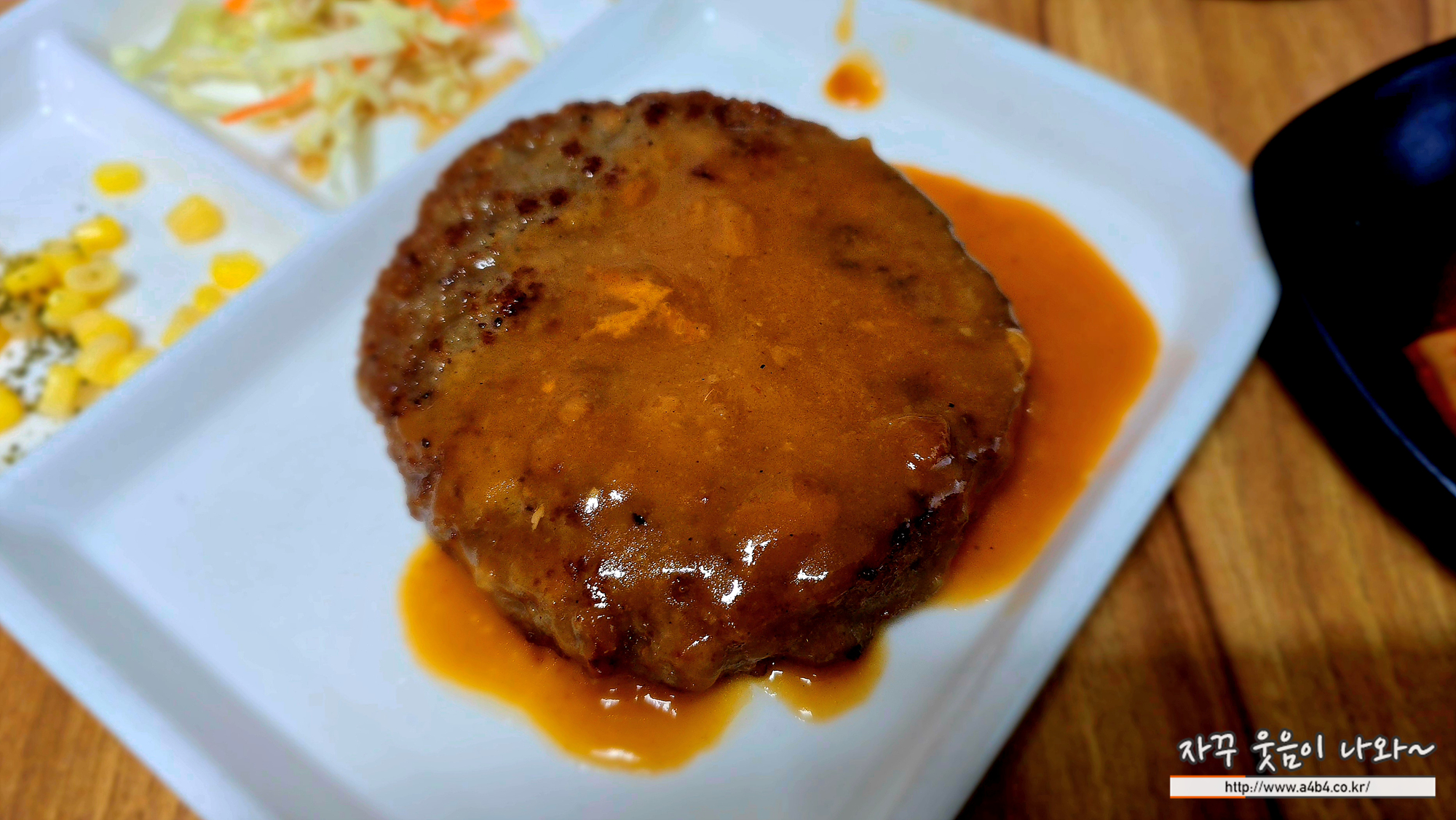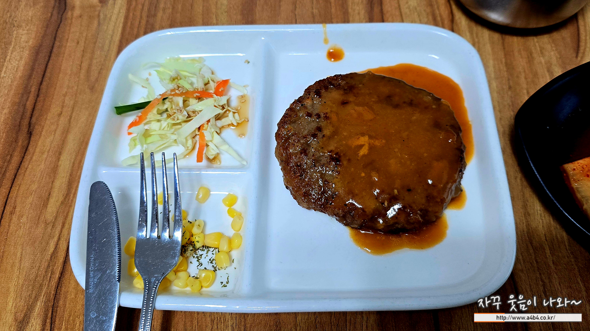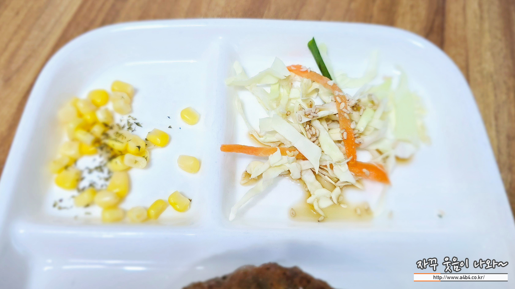 아이들을 위한 메뉴입니다. 어른이 드시기에는 그다지 추천 드리지는 않습니다. 떡갈비 한 장과 순두부 조금 나오네요. 이렇게 옥수수와 양배추 샐러드 약간...