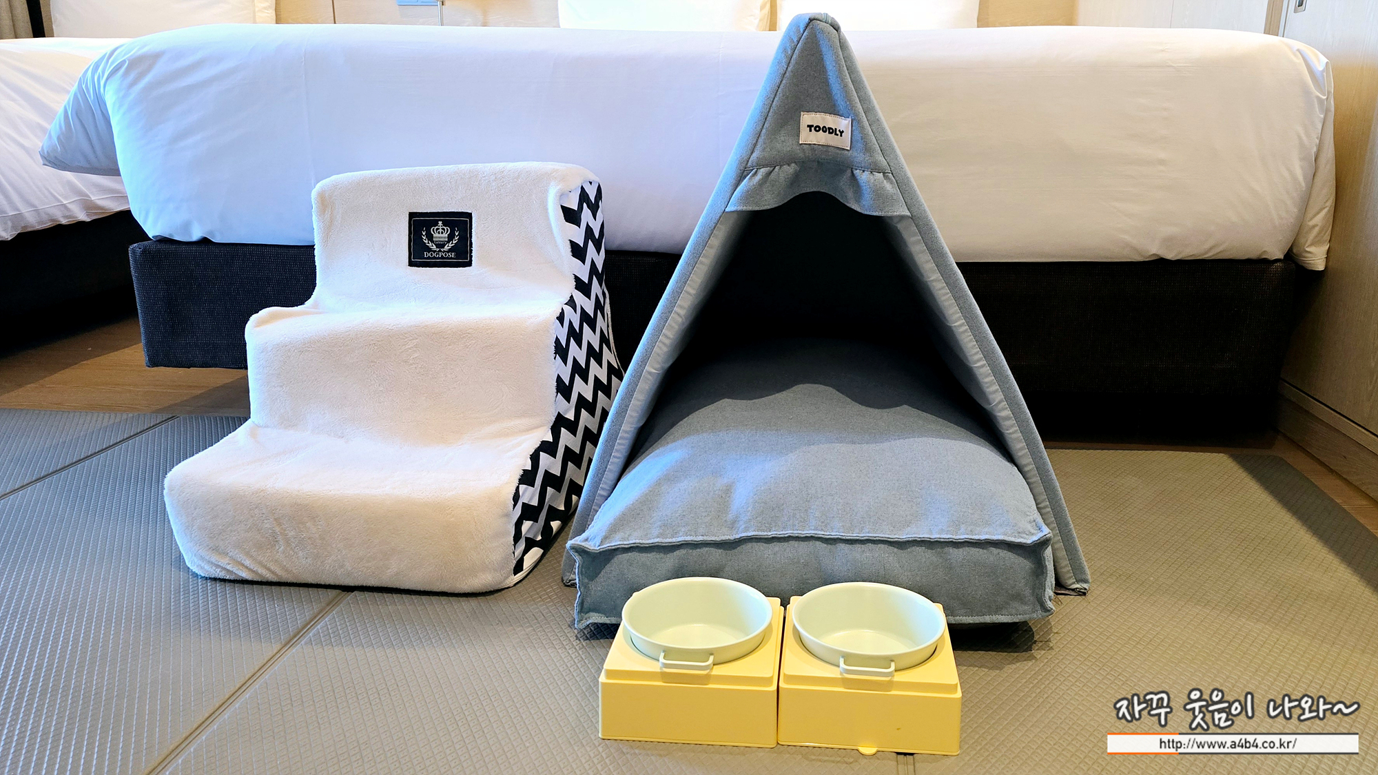 강아지 계단과 밥그릇과 물그릇, 배변배트, 배변패드, 텐트가 준비되어 있는데요. 사진속 강아지 텐트는 소형견 이용이 가능할 것 같네요. 6~7kg만 넘어가도 작아서...