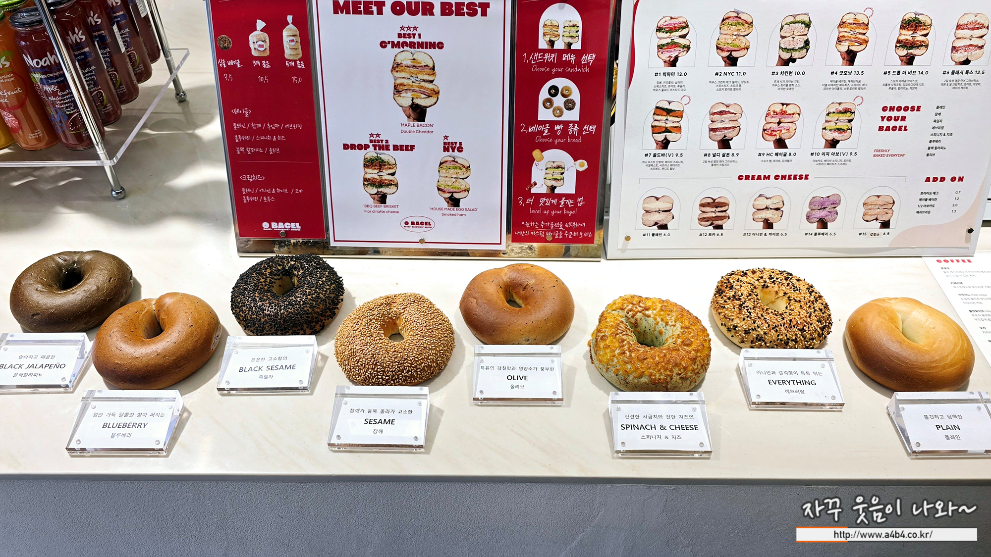 블랙할라피뇨, 블루베리, 흑임자, 세서미, 올리브, 시금치 치즈, 에브리띵, 플레인 베이글...