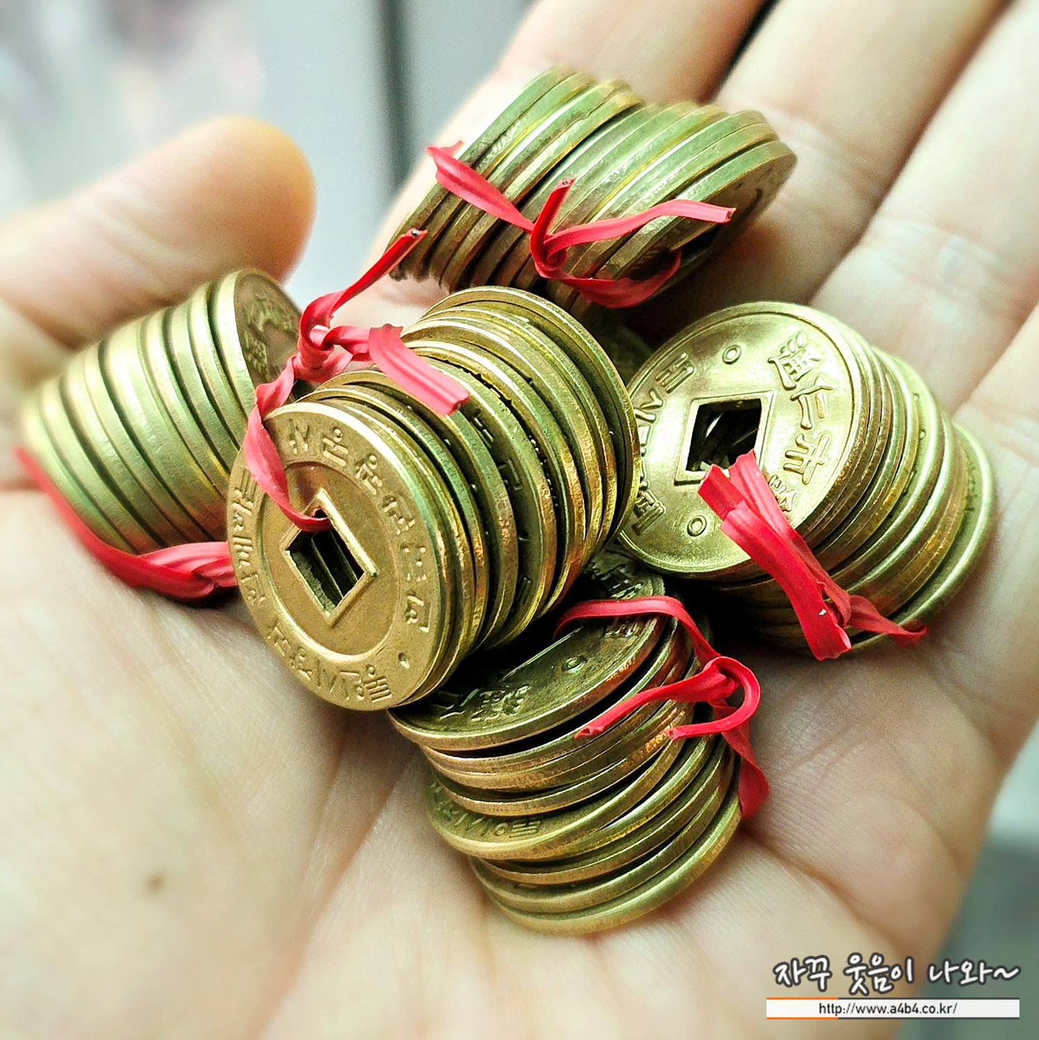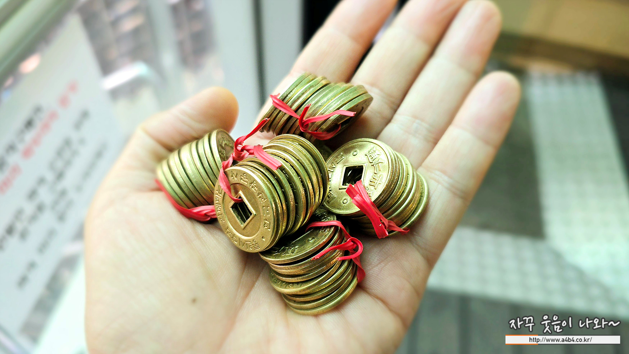 바로 이렇게 생긴 엽전인데요. 엽전 한 개에 500원, 한 묶음에10개 5,000원 입니다. 엽전을 구매하면 검은색 도시락통을 같이 주시고요. 남은 엽전은 환불이 가능합니다.