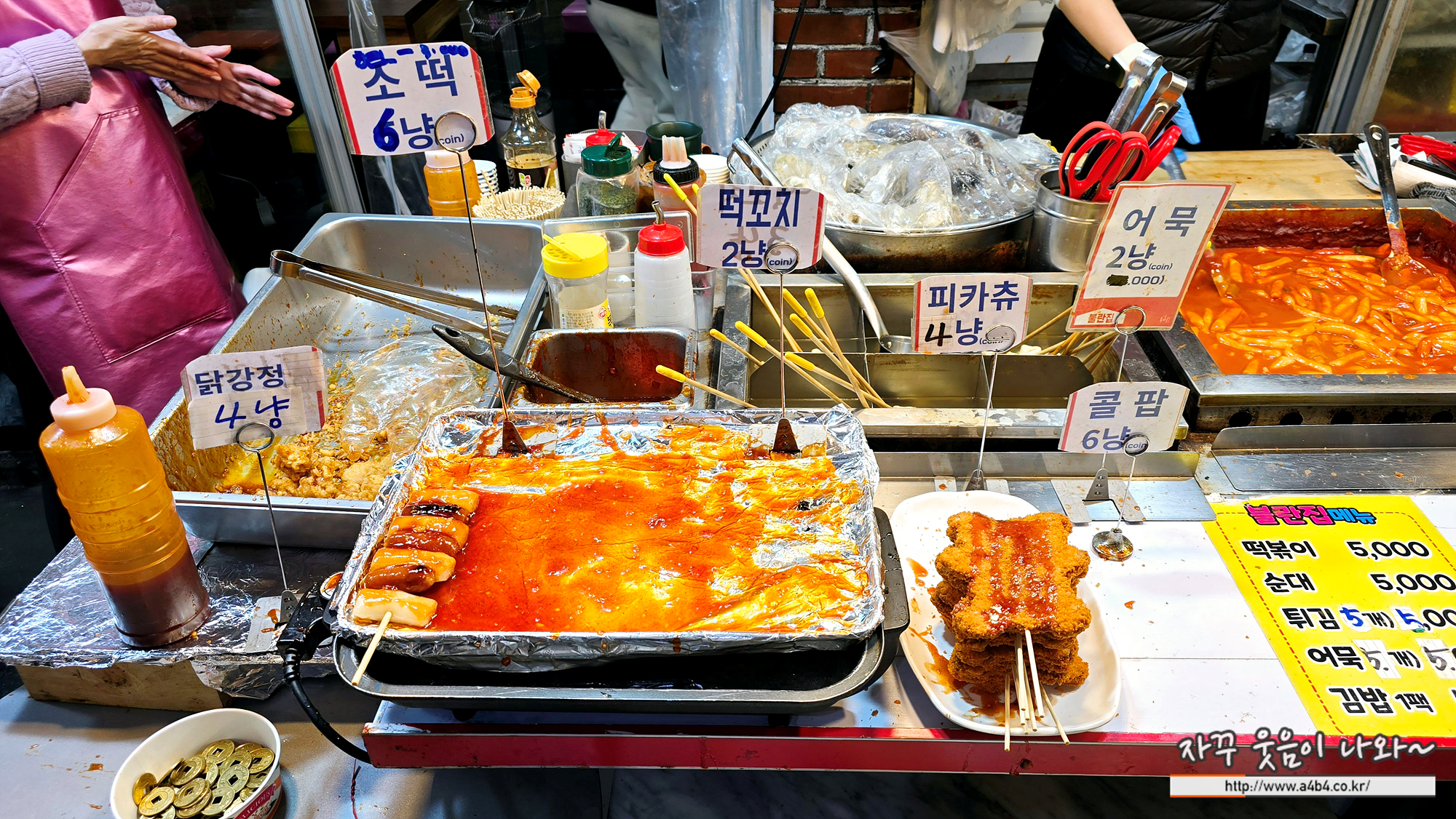 튀김류 등 아이들이 좋아하는 분식류 가격은 보통 2,000원 전후. 치킨 강정은 4,000원, 어묵은 한 개 1,000원 정도 가격입니다. 떡볶이와 순대는 각각 5,000원 정도인데요. 뭐 맛은 쏘소합니다. 정신없는 시장의 맛...