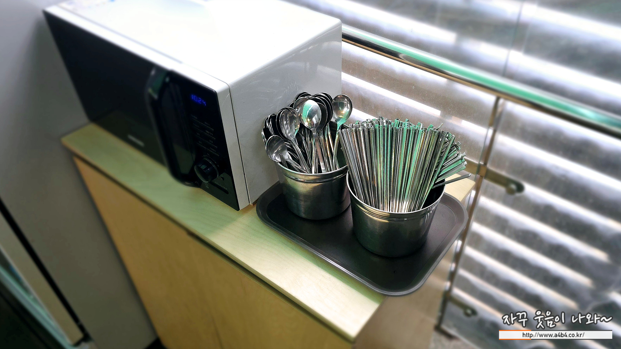 통인시장 도시락카페 3층모습입니다. 중간에는 전자레인지와 수저, 저분이 준비되어 있네요.