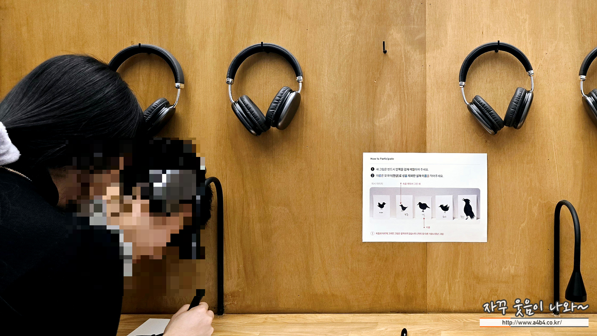 이곳은 관람객이 참여할 수 있는 공간인데요. 아래와 같은 방법으로 관람객이 헤드폰에서 나오는 새소리를 듣고 자유롭게 새를 그리는 경험할 수 있는 공간입니다.