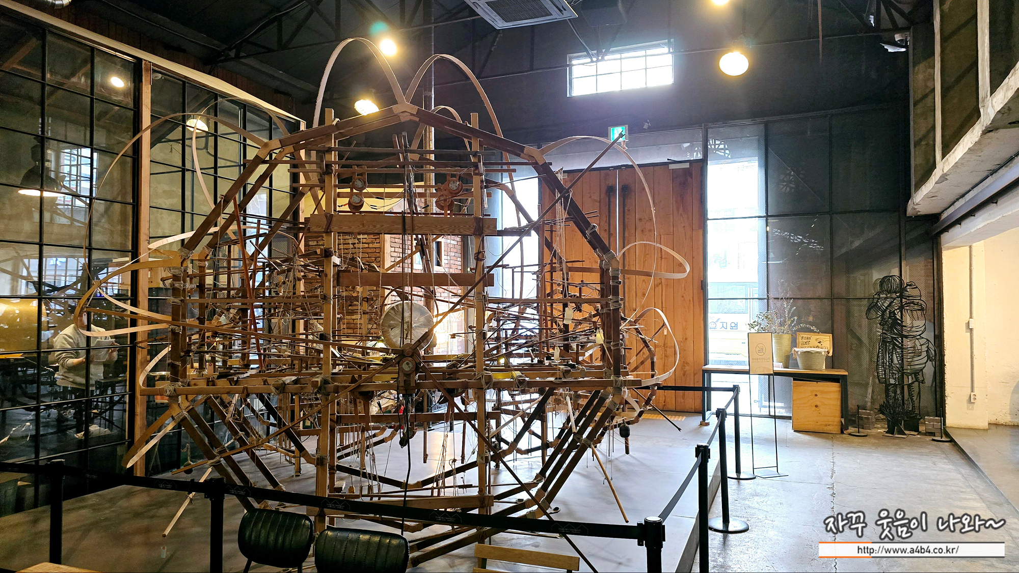 성수동 대림창고 카페 커다란 문을 열고 들어와 카페 안쪽으로 들어오니 거대한 작품 두 점이 매달려 있습니다.