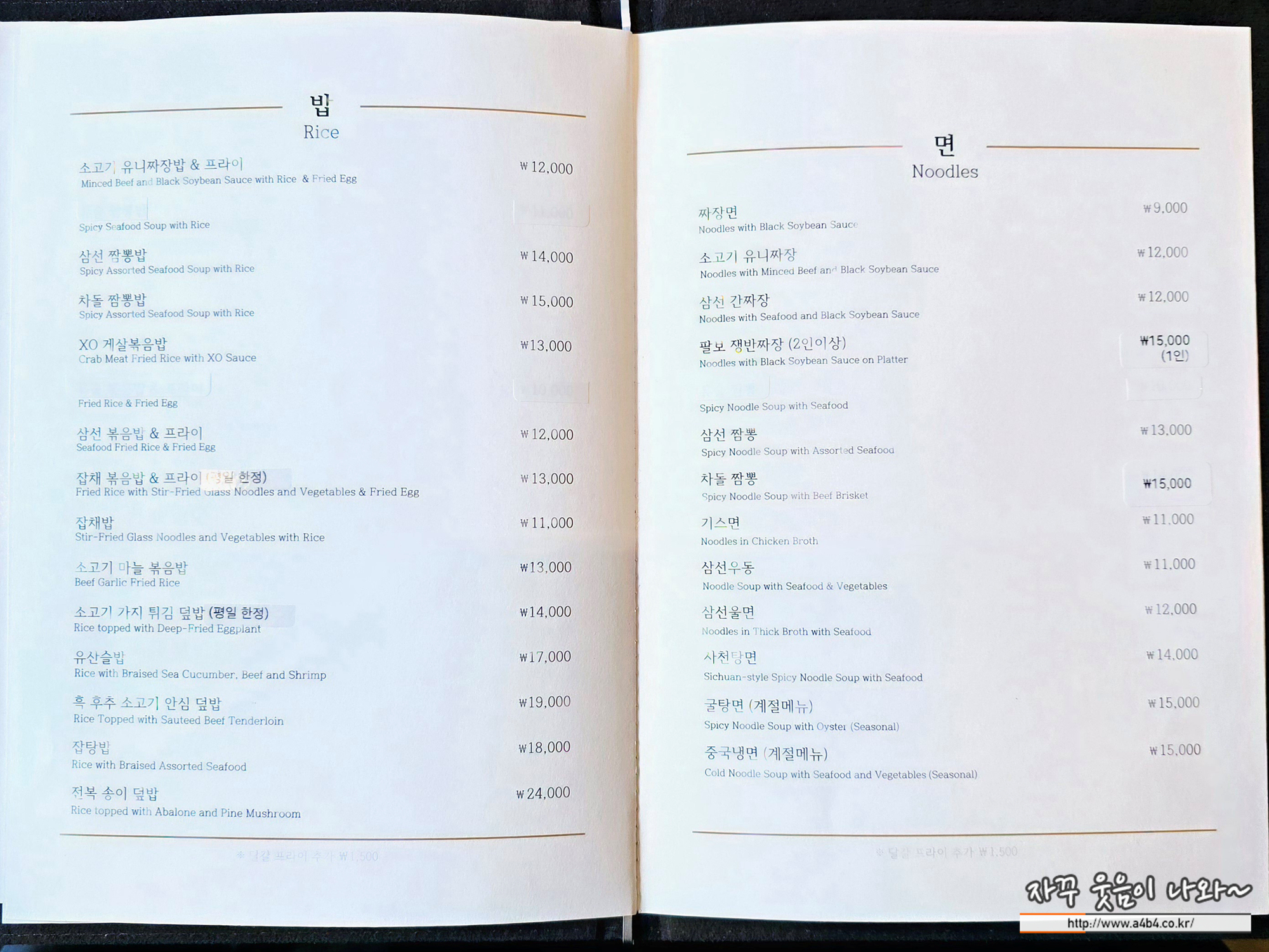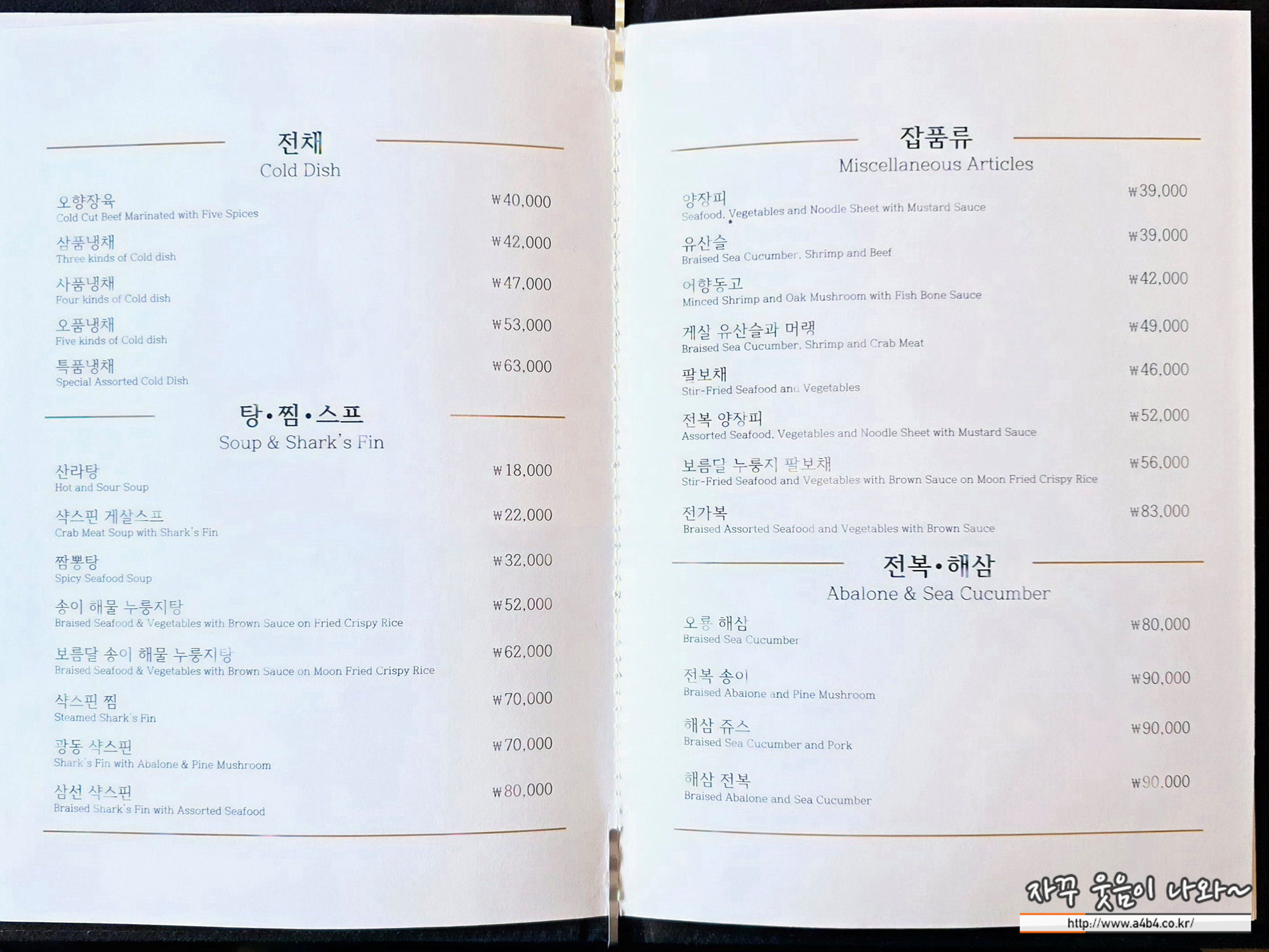 요향장육, 냉채 등의 전채요리, 샥스핀게샬스프, 누릉지탕 등의 탕 찜 스프류, 유산슬, 어향동고, 팔보채 등의 잡품류와 전복 해삼료이가 마련되어 있습니다.