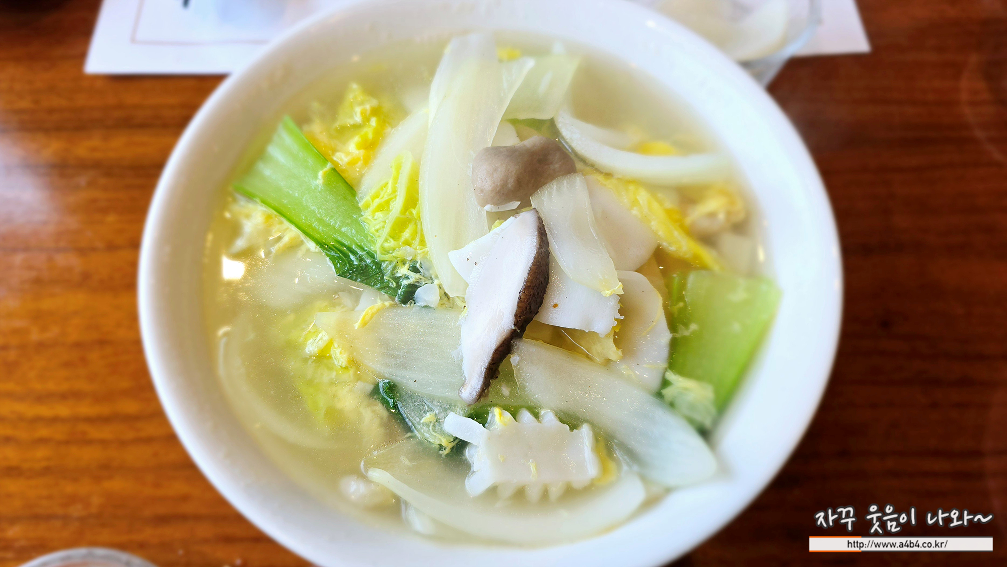 그랑차오 삼선우동입니다. 중국식 우동은 우리가 흔히 짬뽕우동이라고 부르는 메뉴로 일본식 우동보다 진한 국물맛과 버섯, 오징어, 청경채, 새우 등의 해산물과 채소가 듬쁙 들어가 감칠맛을 보여주고 있습니다.
