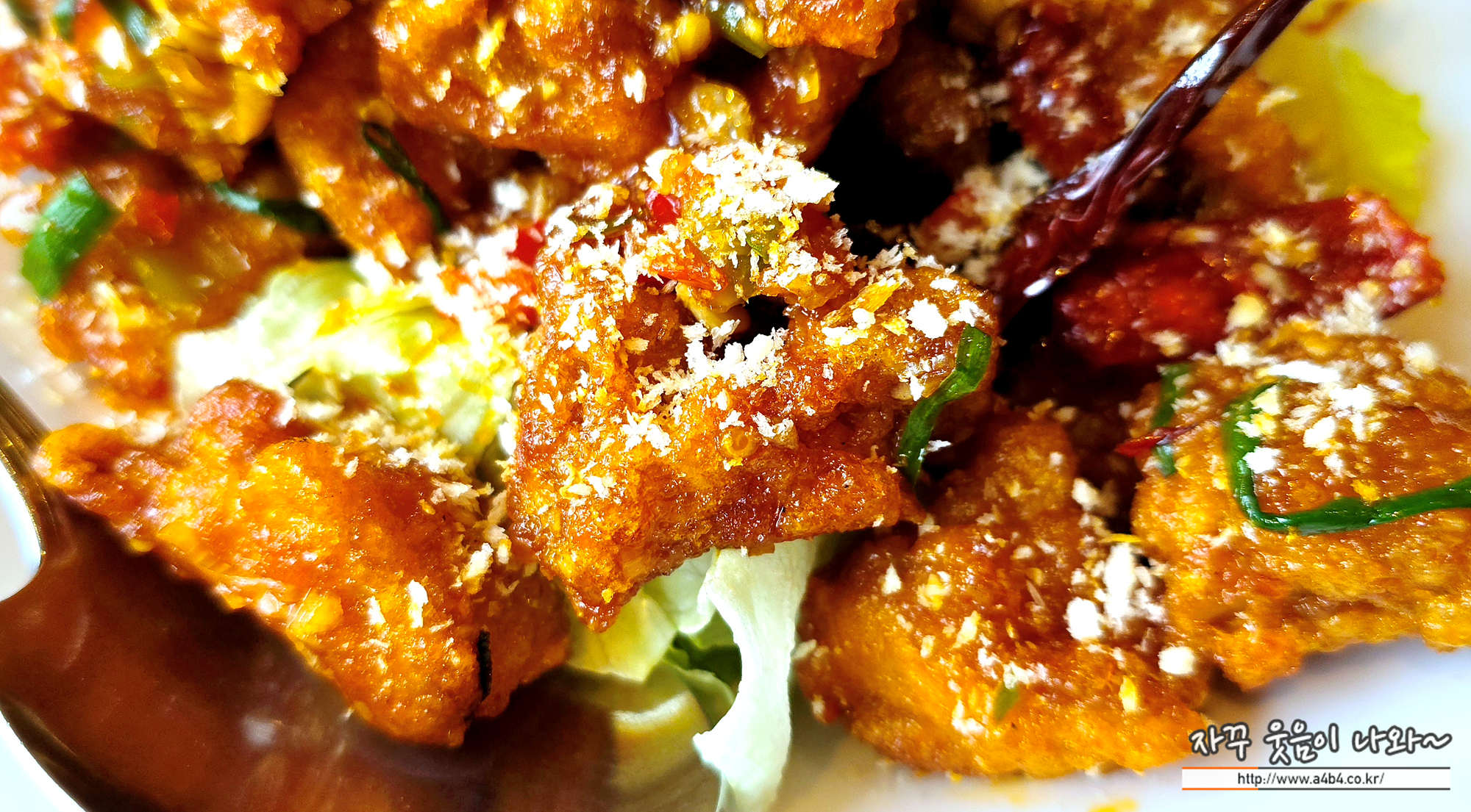 깐풍기 매운맛은 아주 강하지는 않고요. 약간 매콤한 정도의 맛을 보입니다. 물론 고추를 먹으면 특유의 알싸한 느낌은 상당히 강합니다. 빼갈 한잔과 함께하면 참 좋은... (차를 가지고 와서 술은 포기)