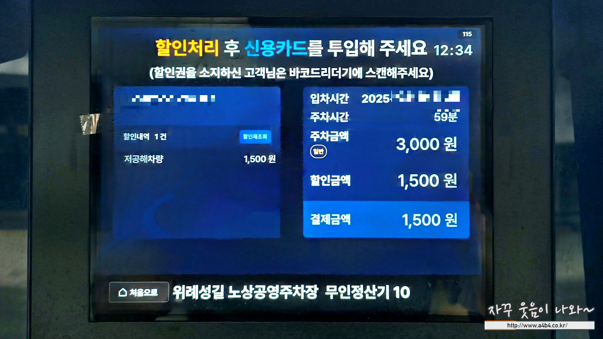 만약 2시간 이내에 식사를 마치고 출차 한다면 할인금액을 고려하면 그랑차오 주차장 보다 건물 앞 공영주차장 주차요금이 더 저렴하네요. 저도 한 시간 정도 주차했고 50% 할인받아 1,500원 주차요금 지불 했습니다. 오히려 건물뒤 주차장보다 주차 및 출차가 편하다는 생각입니다. 골목으로 들어갈 필요 없고요.