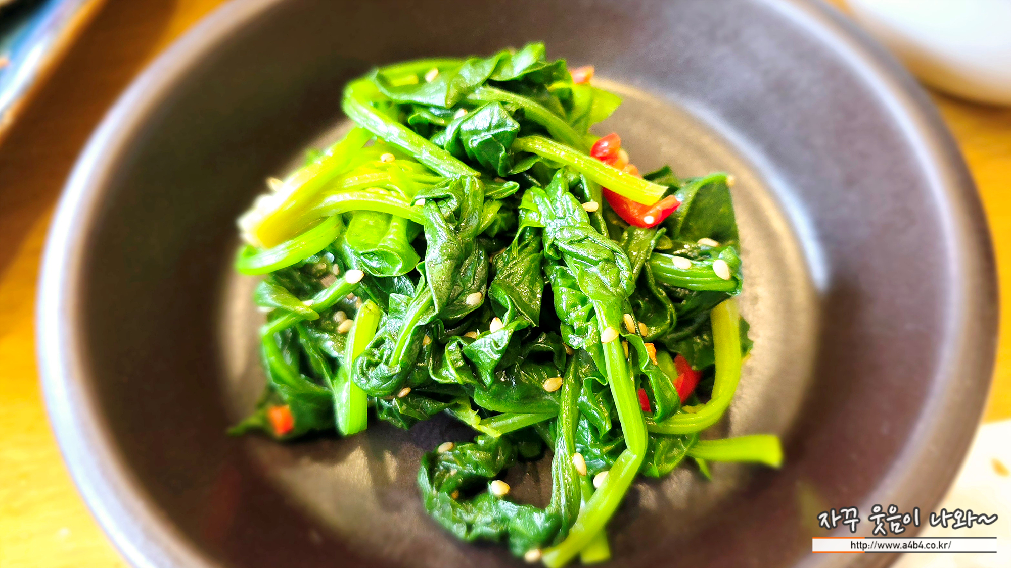 김치, 시금치, 무채, 멸치볶음 기본 4찬이 나오고요