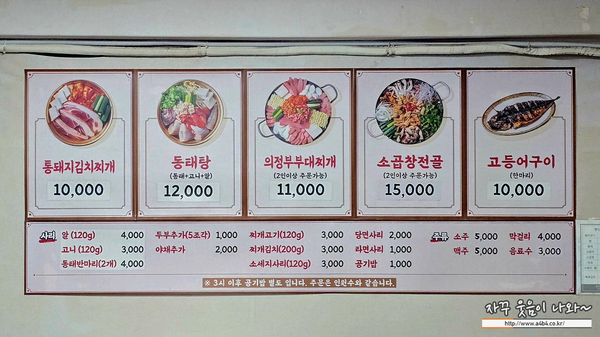 메뉴는 통돼지 김치찌개 10,000원, 양푼이 동태탕 12,000원, 고등어구이 10,000원, 소곱창전골 15,000원, 의정부 부대찌개 11,000원 압니다 여기에 여러 사리들을 추가할 수 있고요.