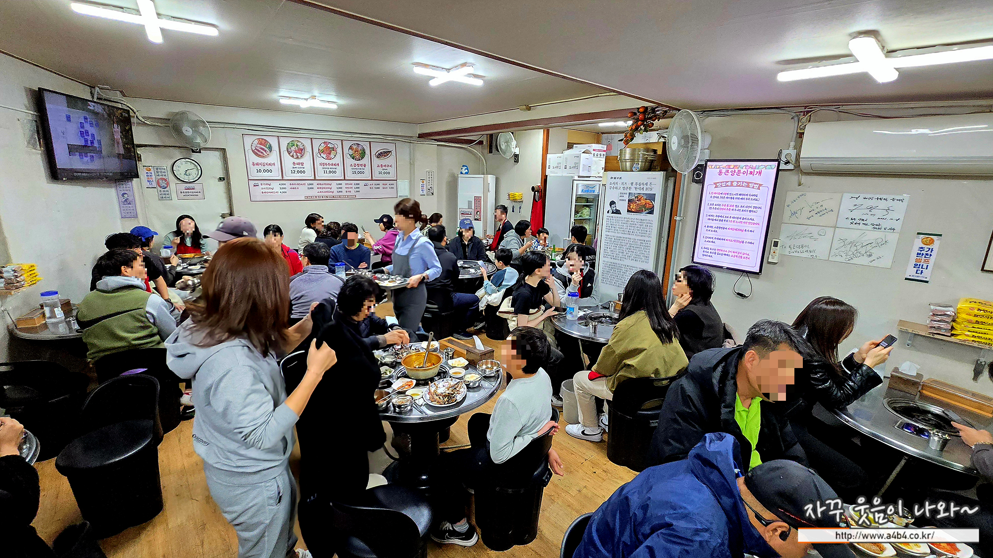 강동구청 맛집 통큰양푼이찌개 실내입니다. 올드한느낌의 추억의 식당 분위기로 테이블은 10석 조금넘게 준비되어 있습니다. 저희는 주말 늦은 저녁에 방문했는데요. 통큰양푼이찌개 본점 웨이팅이 있네요. 저희 앞으로 1팀, 뒤로 3팀이 있었는데, 한 10~15분 정도 대기 후 자리에 앉을 수 있었습니다.