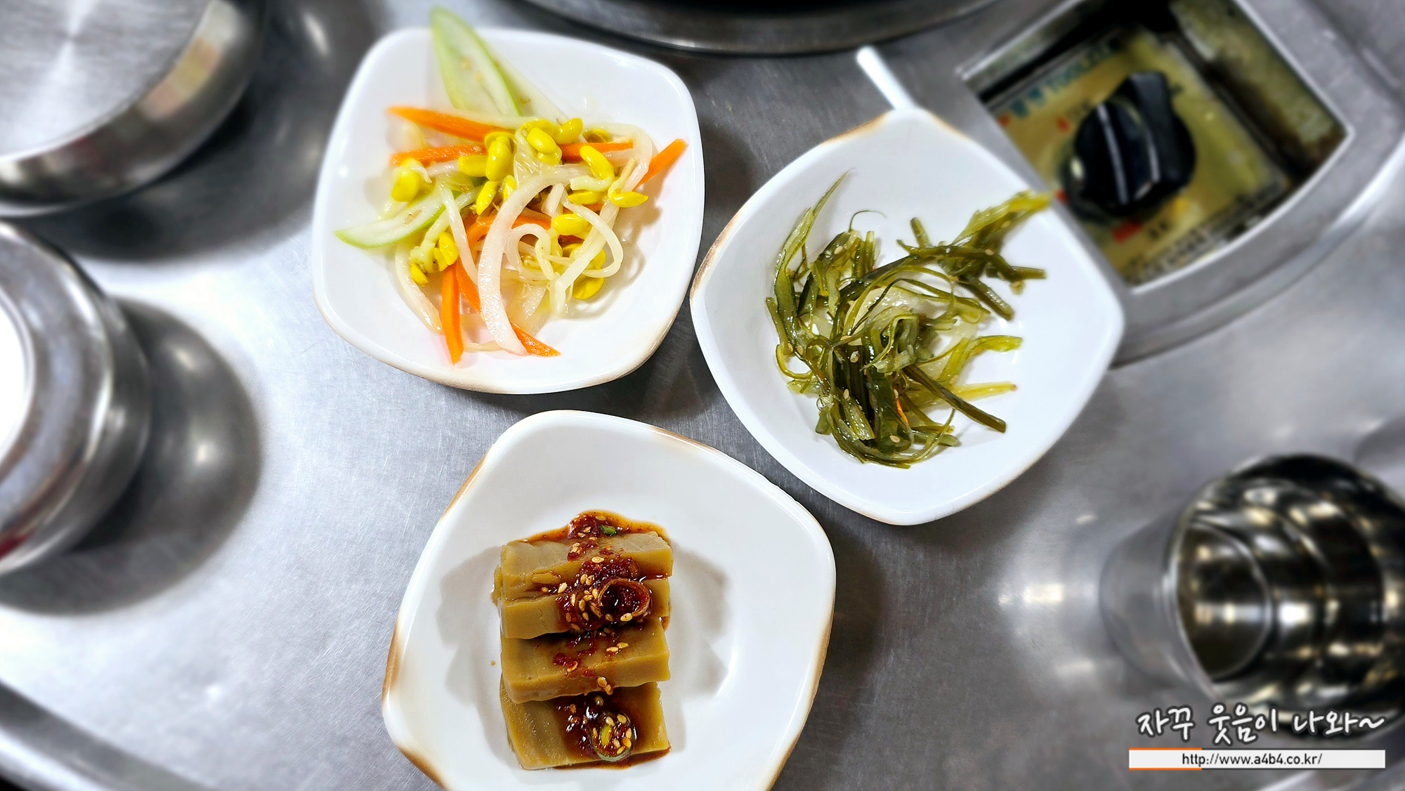 기본 반찬은 콩나물 무침과 미역줄기, 도토리묵이 나오고요. 추가로 필요하시면 김치 반찬이 있습니다.