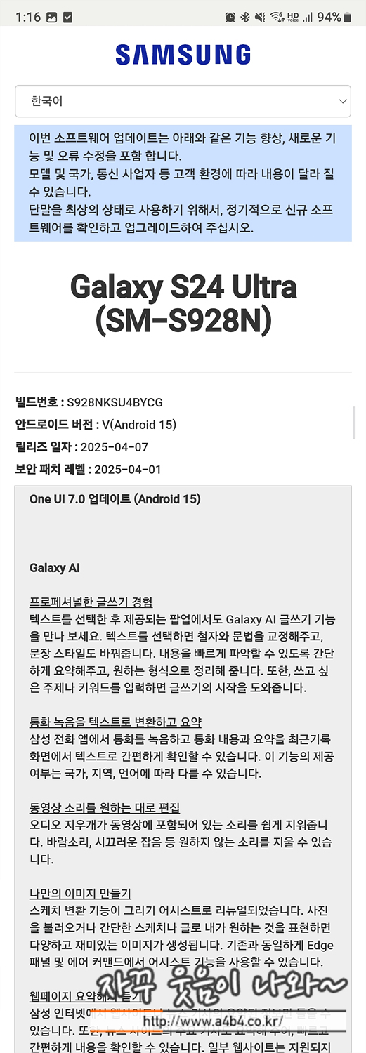 오늘 ONE UI 7.0 업데이트로 사용한 스마트폰은 갤럭시 S24울트라 모델입니다. 해당 기준으로 리뷰진행 합니다.