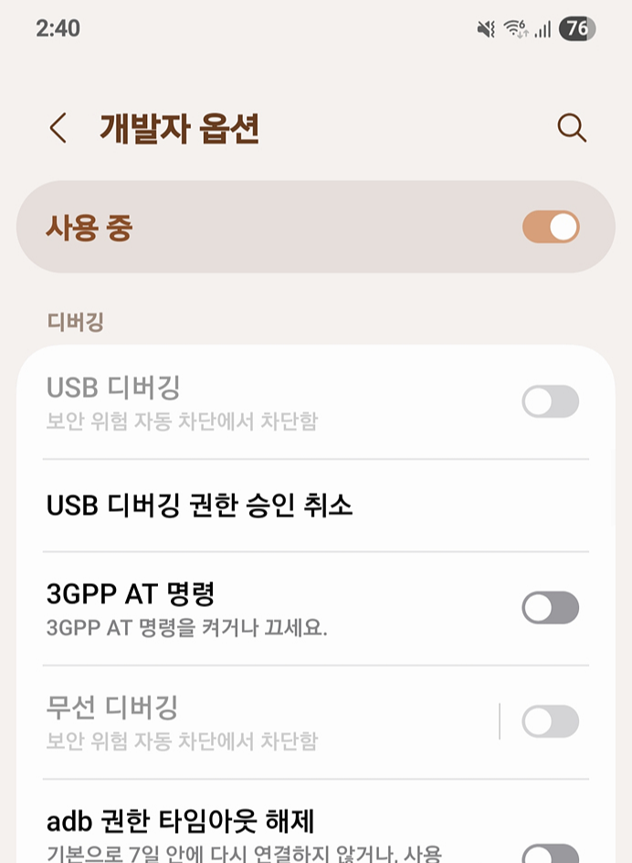 | USB 디버깅, 무선 디버깅 비활성화 해제