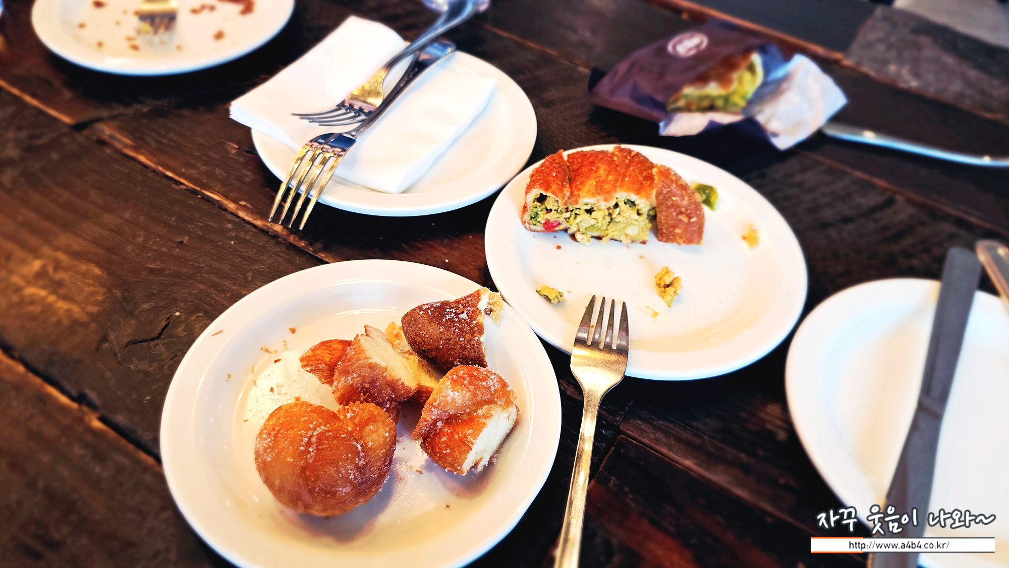 아래와 같이 여유있는 공간에서 구매한 빵을 먹을 수 있습니다. 접시와 나이프 포크 등은 셀프
