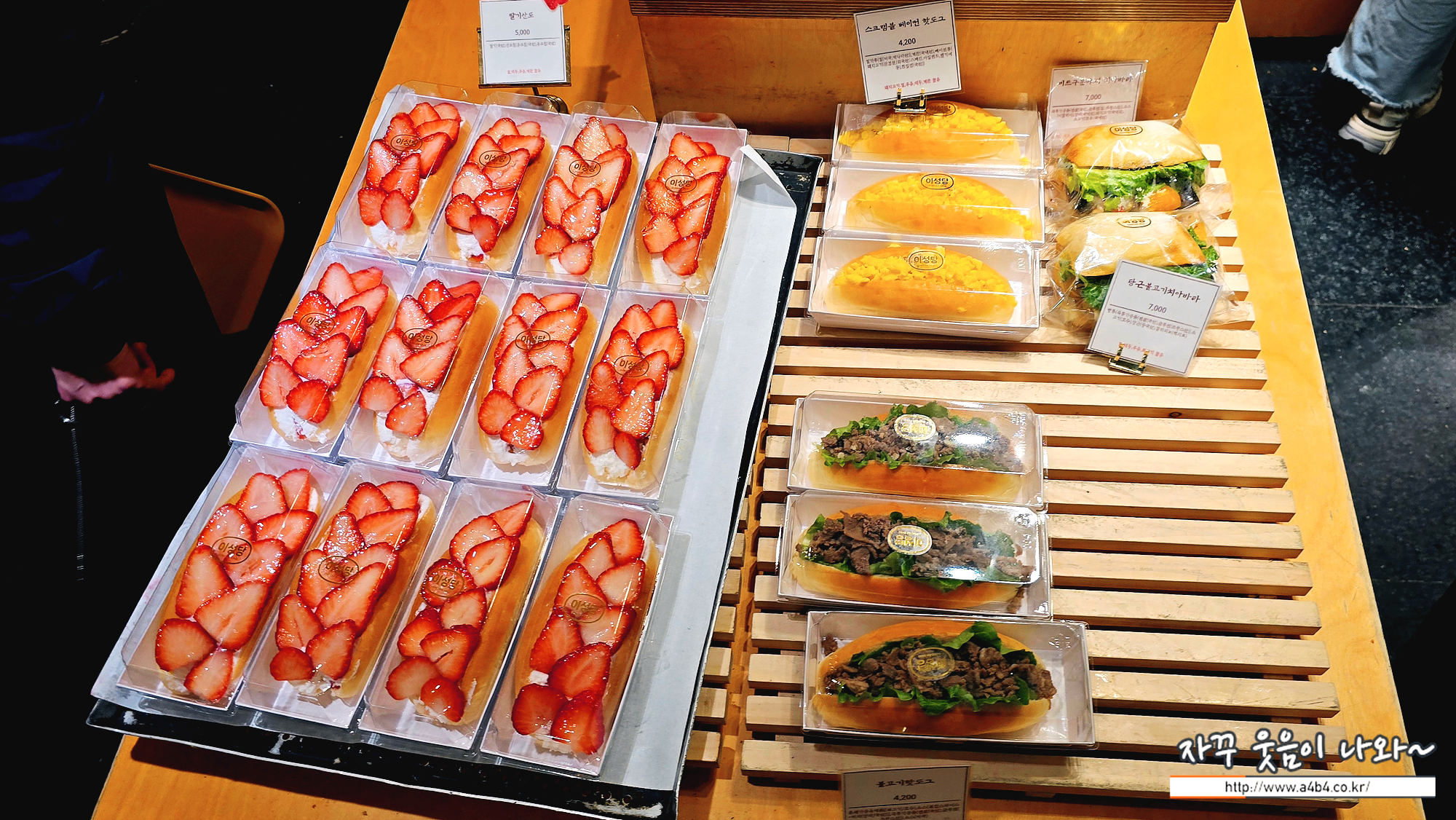 딸기 산도 5,000원, 스크럼블 베이컨 핫도그 4,200원, 당근불고기치아바타 7,000원