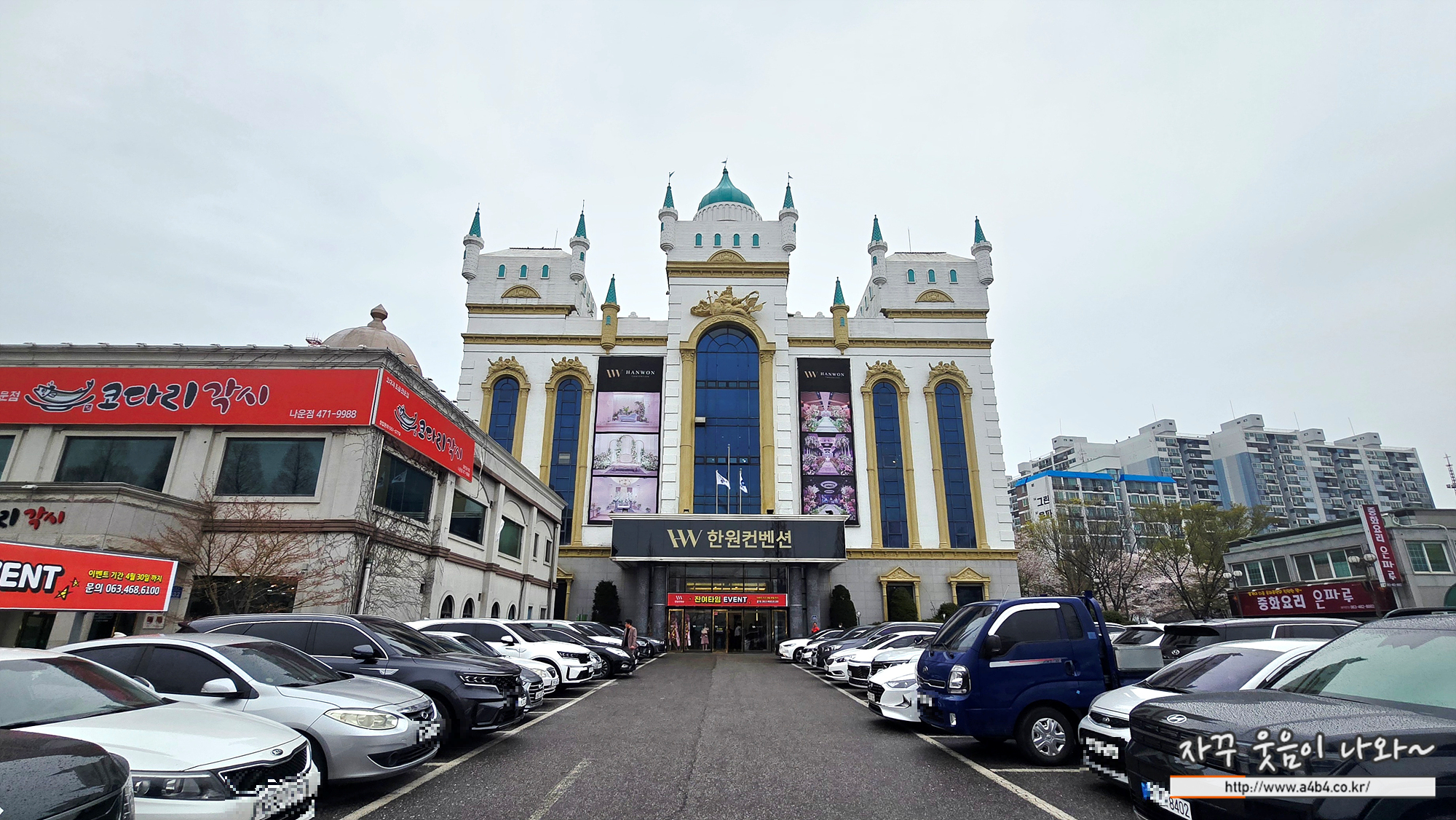 위치는 전북 군산시 대학로 430 으로 군산 은파유원지 건너편에 위치해 있습니다. 사진과 같이 궁전 모양의 건물로 되어 있고요. 한원컨벤션 주차장은 예식홀 앞에 50여대 추차 가능한 공간과 웨딩홀 뒷편에 별도 주차장이 마련되어 있습니다. 제가 방문한 토요일 오후에는 이미 웨딩홀 주차장은 자리가 없어 뒷편으로 안내받았습니다.