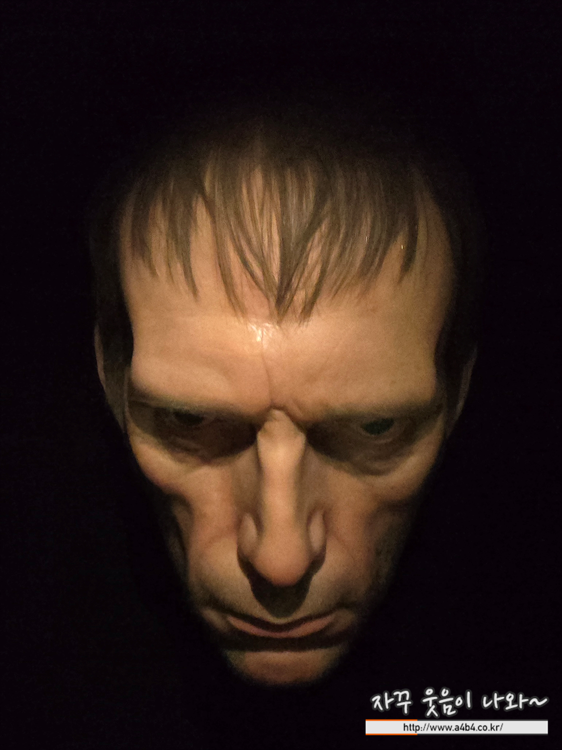하지만 뮤익의 다른 작품과는 달리, 세부적인 요소보다는 희미하게 드러나는 마스크의 윤곽이 더 도드라집니다. 여기서 우리가 대상과 공유하는 것은, 어두운 공간뿐입니다. 어둠은 디테일을 숨기고, 캐릭터의 감정적 표현을 내세웁니다. 그 감정을 유추해낼 단서는 없습니다. 주변 공간이나 맥락과 상관없이 독립적으로 존재하는 마스크는 유령처럼, 해골처럼 어두운 공간에 떠올라 있을 뿐입니다.