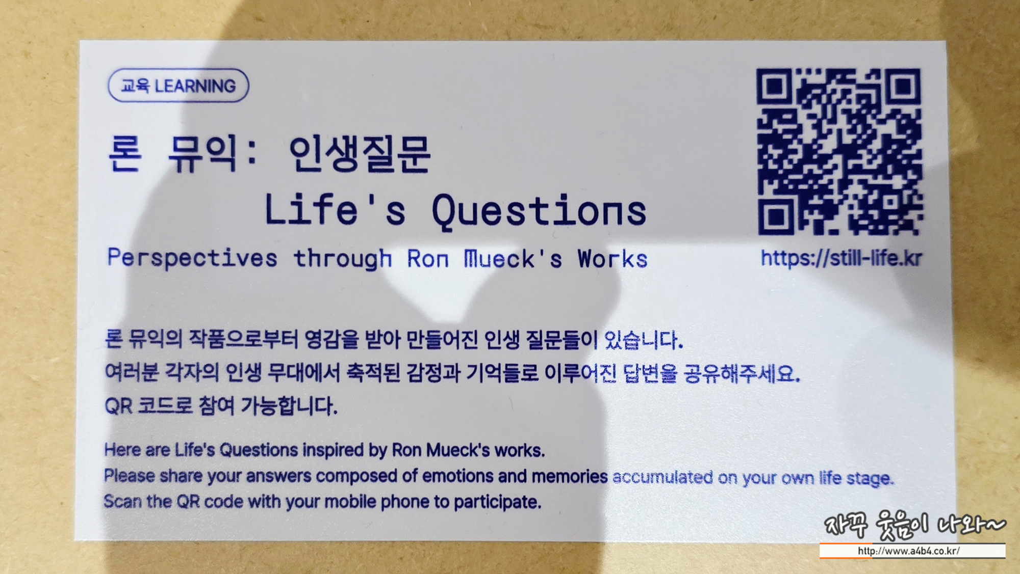 아래 QR통해 접속하시면 인생관련 5가지 질문을 받고 답하게 되는데요. 마지막에는 다른 사람들의 답변들도 확인할 수 있습니다.