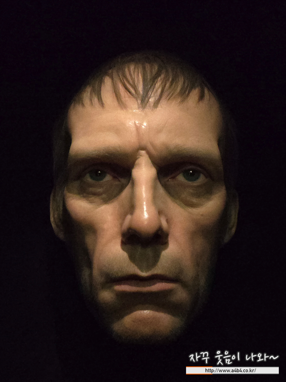 하지만 뮤익의 다른 작품과는 달리, 세부적인 요소보다는 희미하게 드러나는 마스크의 윤곽이 더 도드라집니다. 여기서 우리가 대상과 공유하는 것은, 어두운 공간뿐입니다. 어둠은 디테일을 숨기고, 캐릭터의 감정적 표현을 내세웁니다. 그 감정을 유추해낼 단서는 없습니다. 주변 공간이나 맥락과 상관없이 독립적으로 존재하는 마스크는 유령처럼, 해골처럼 어두운 공간에 떠올라 있을 뿐입니다.