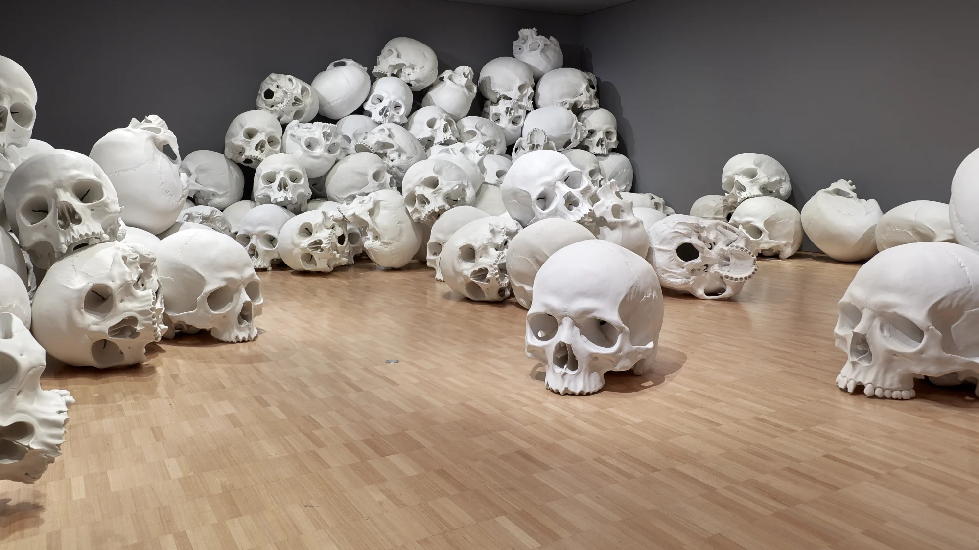 론 뮤익은 1997년에 제작한 ‹죽은 아빠›이후 약 20년 만에 다시 죽음을 주제로 한 조각 설치 작품, ‹매스›를 선보였습니다. 거대한 인간 두개골 100개로 구성된 작품이죠. 몇몇 두개골은 색상과 형태가 미묘하게 다르긴 하지만, 개별적인 정체성을 알아볼 수 있는 단서는 거의 없습니다. 이 작품에서 중요한 것은, 개별적인 두개골이 아니라는 뜻입니다. 뮤익이 이전까지 개별 인물의 고립된 상태를 탐구해왔다는 점에서, 이전의 작업들과 차별화되는 작품입니다.
