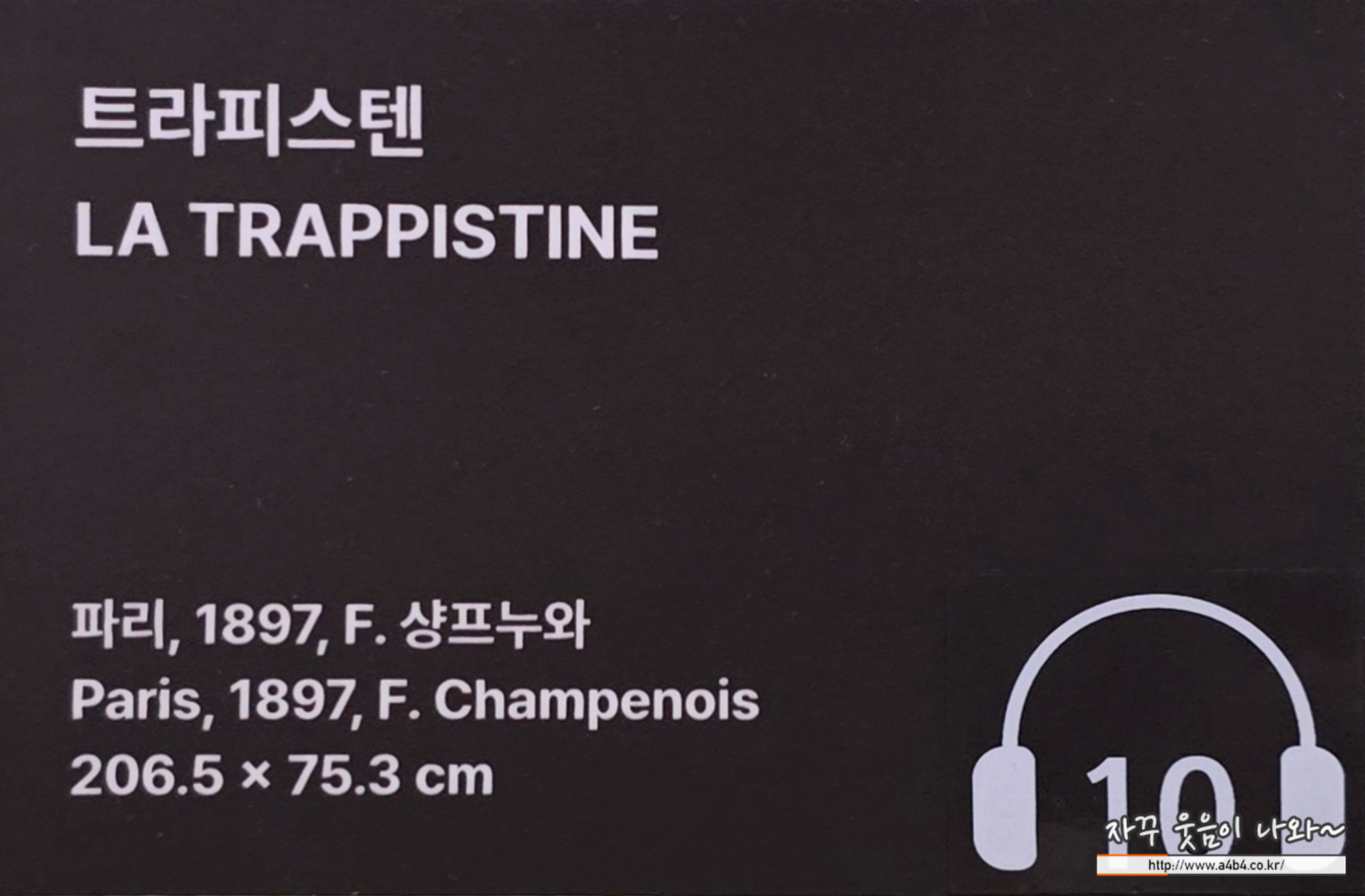 트라피스트회는 17세기에 설립된 종교 단체로, 노르망디 트랍 대수도원에서 시작된 것으로 알려져 있습니다. 여성의 헤어스타일은 무하의 다른 그림과 달리 구불거리지 않습니다. 대신 그녀의 곧은 머리카락은 관람자의 시선을 자연스럽게 테이블 위의병으로 이급니다. 여성이 들고 있는 꽃은 음료의 제조에 사용되는 다양한 허브를 상징합니다. 수직적인 구도, 장식이 없는하단, 그리고 모든 요소의 완벽한 조화는 <지스몽다>포스터를 연상시킵니다.