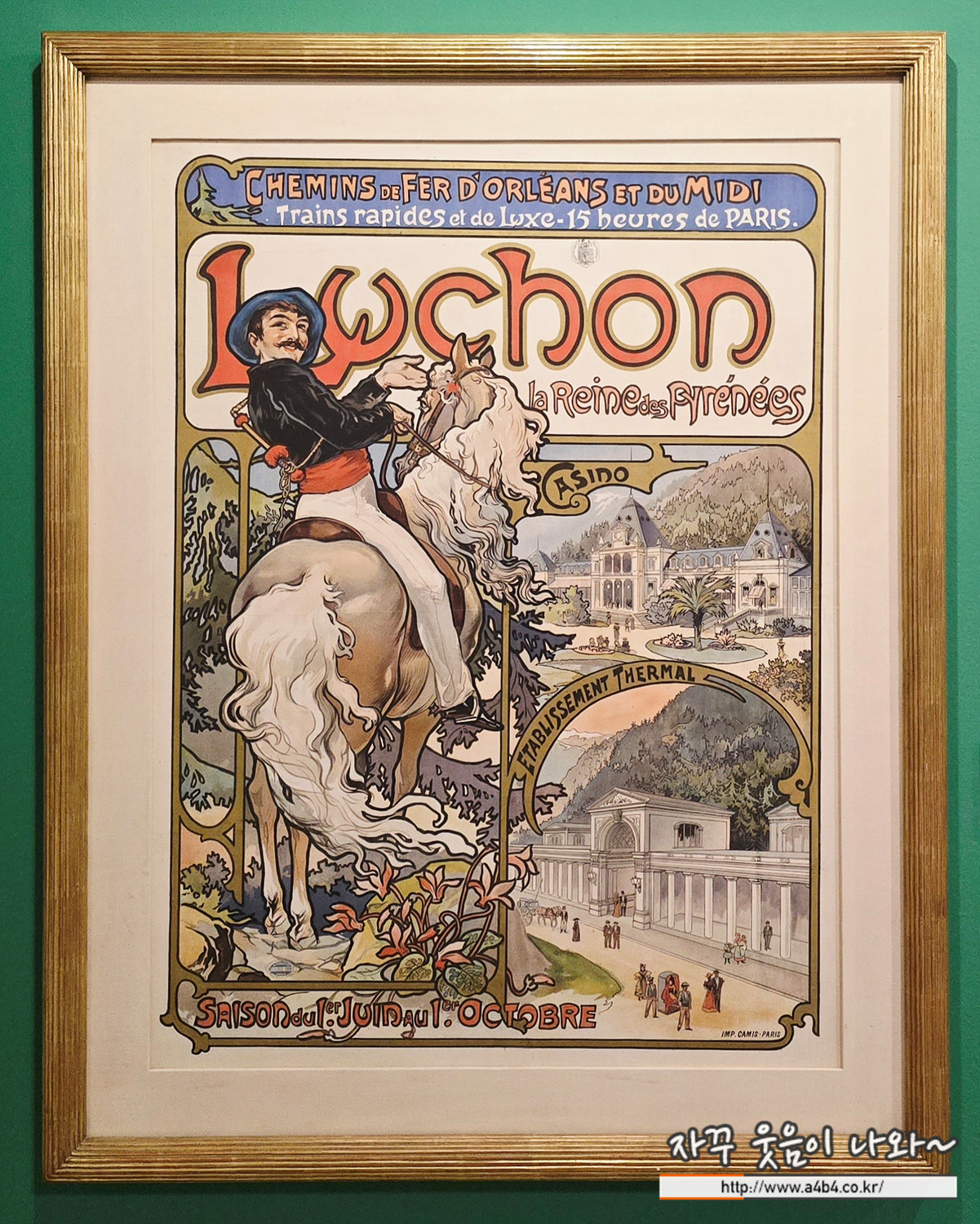 프랑스남서부에 위치한 뤼송휴양지로 향하는 기차 노선을 홍보하기 위해 제작된 이 포스터는 무하의 초기 상업 작품 중하나이자, 보기 드물게 여성 모델이 등장하지 않는 작품 중 하나입니다. 그림 속말을 탄 남성이 카지노와 기둥이 줄지어 선 회랑식 목욕탕으로 관람자의 시선을 이급니다. 포스터 속 건물 묘사는 무하가 직접 작업한 것이 아니며, 건축 도면에 익숙하지 않은 사람이 그린 것으로 보입니다. 이 작품은 무하의 서명이 빠져 있어 여러 차례 다른 예술가의 작품으로 오해받기도 했습니다. 그러나 훗날 카탈로그 원본과 무하의 개인 소장품에서 이 작품의 초안이 발견되면서, 결국 무하의 작품임이 확실해졌습니다.