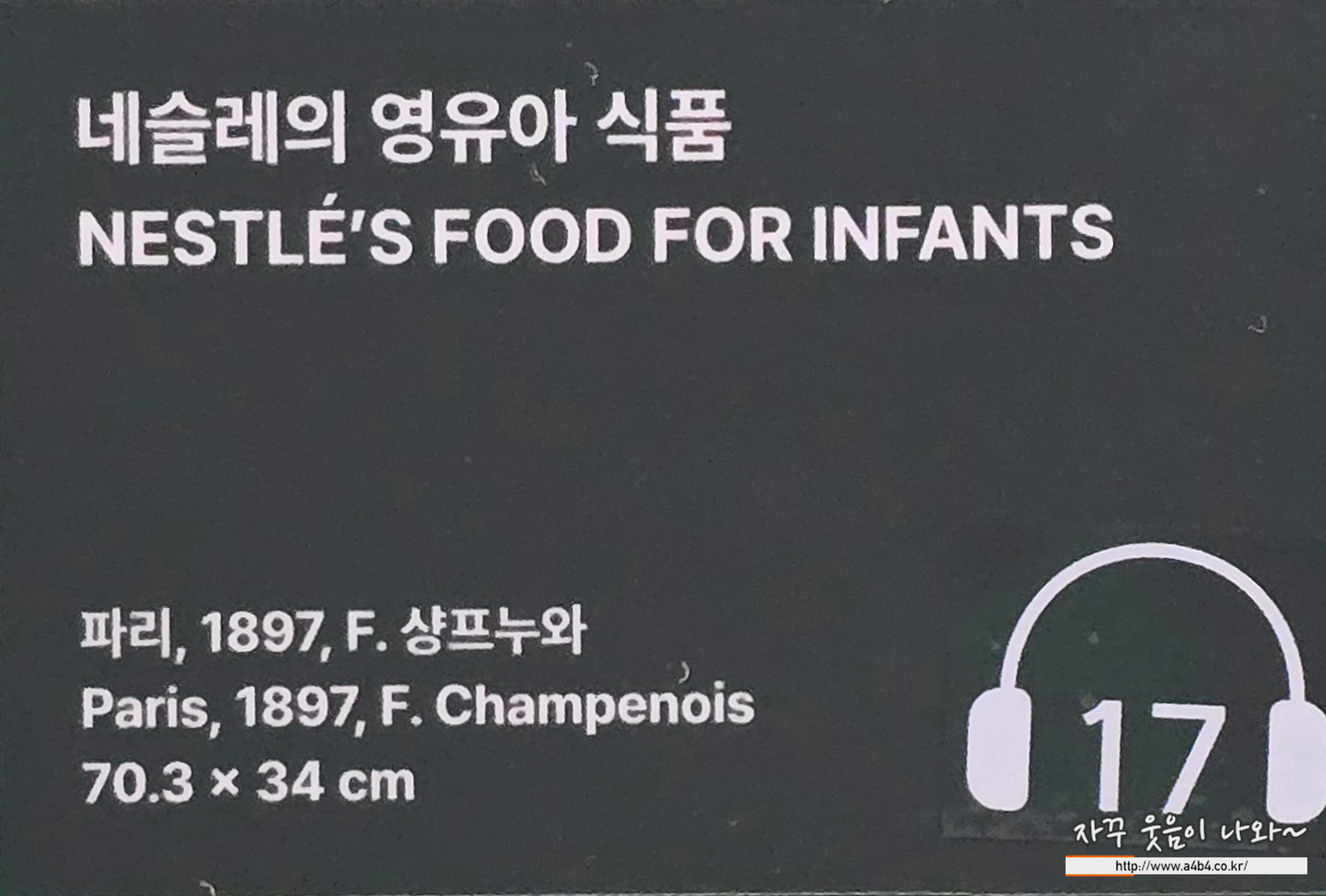 1890년대만 해도 이유식은 주로 모유에 오트밀을 섞어 직접 만들어 먹이는것이 일반적이었습니다. 따라서 포스터 속 어머니가 들고 있는 시판 이유식은 당시에는 생소한 제품이었던 반면, 아기가 타고 있는 나무 요람은 이미 구식으로 여겨지고 있었습니다.