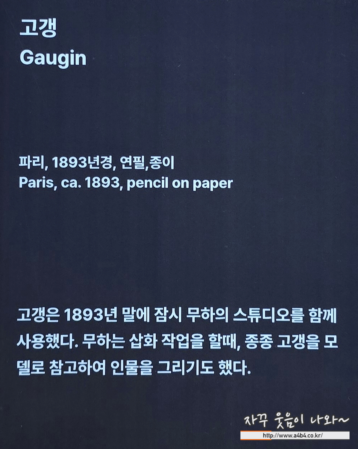 전시장 첫 공간은 우리에게 너무나도 유명한 고갱을 그린 작품으로 시작합니다. 이번에 처음 알았는데 1893년에 고갱은 무하의 스튜디오를 같이 사용했다고 합니다. 동 시대에 전혀 다른 화풍으로 각자 최고의 경지에까지 올라갔다는 것이 너무나도 놀랍네요.