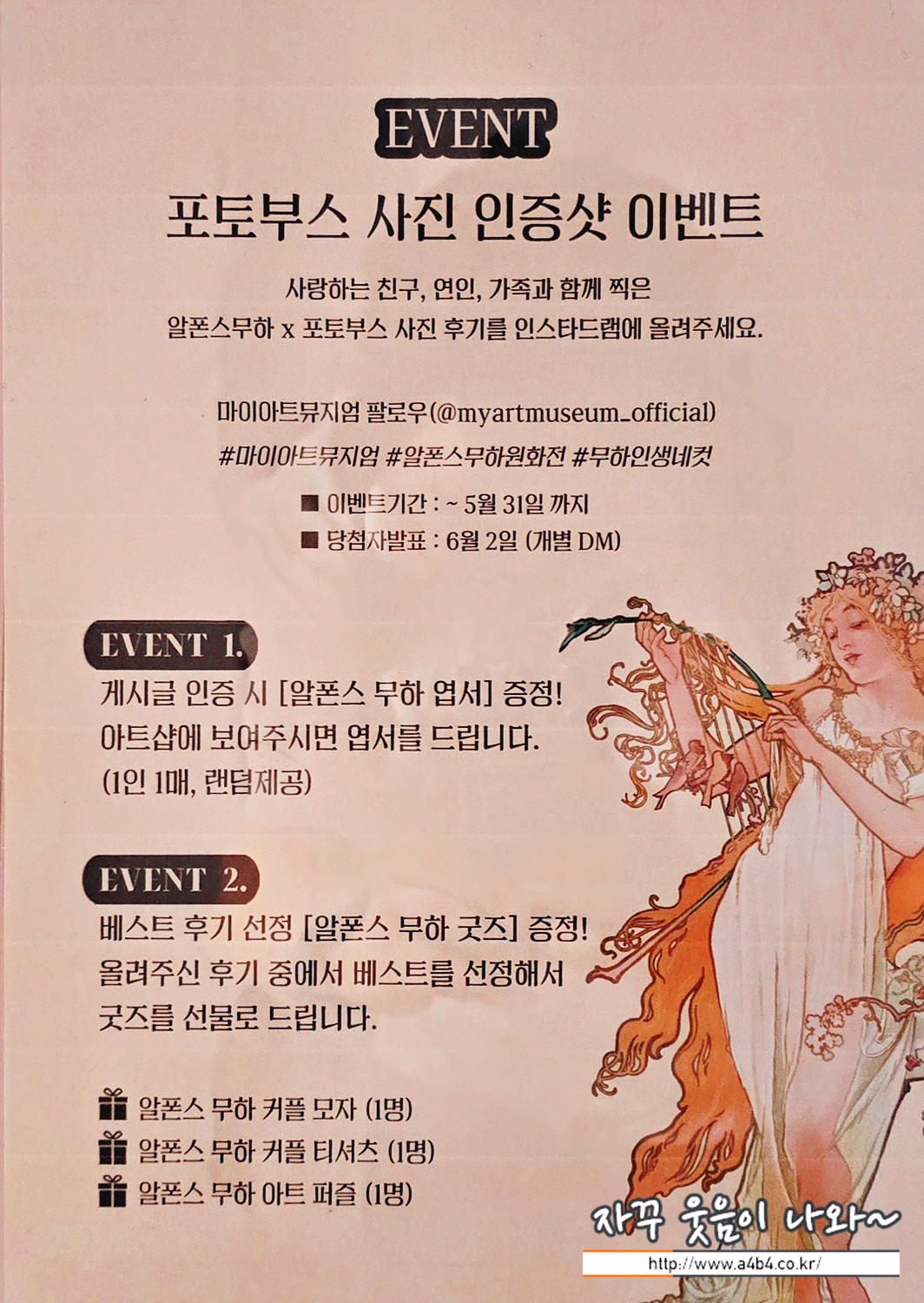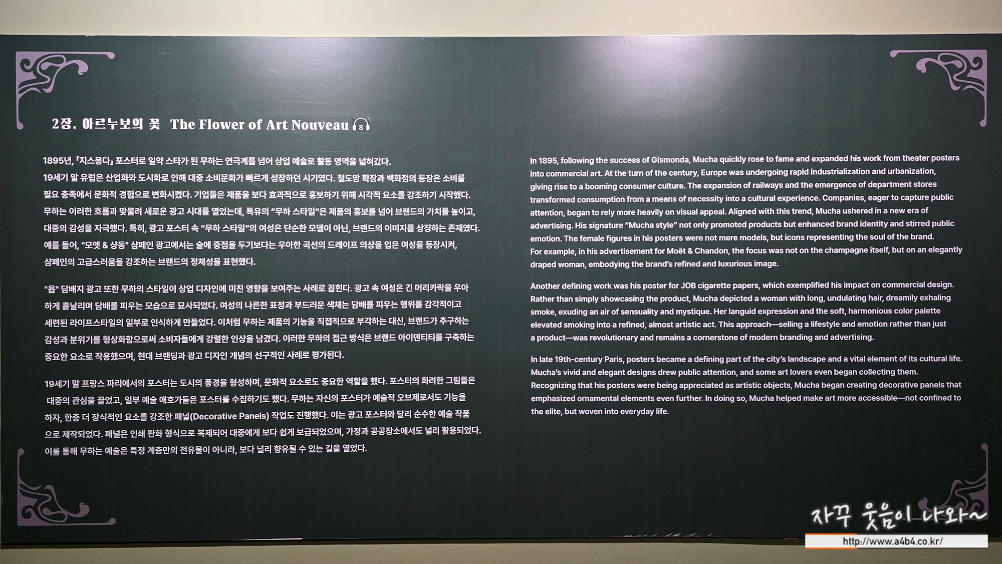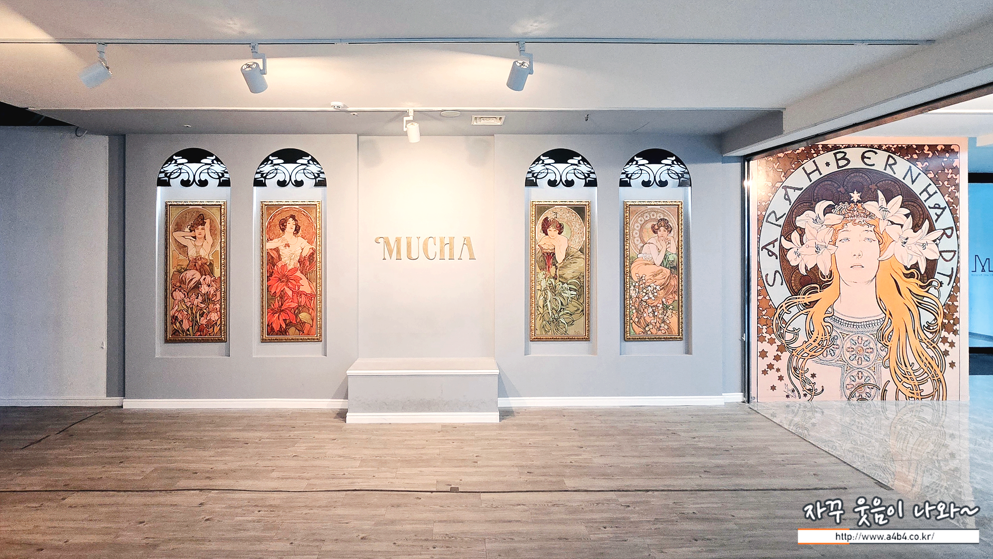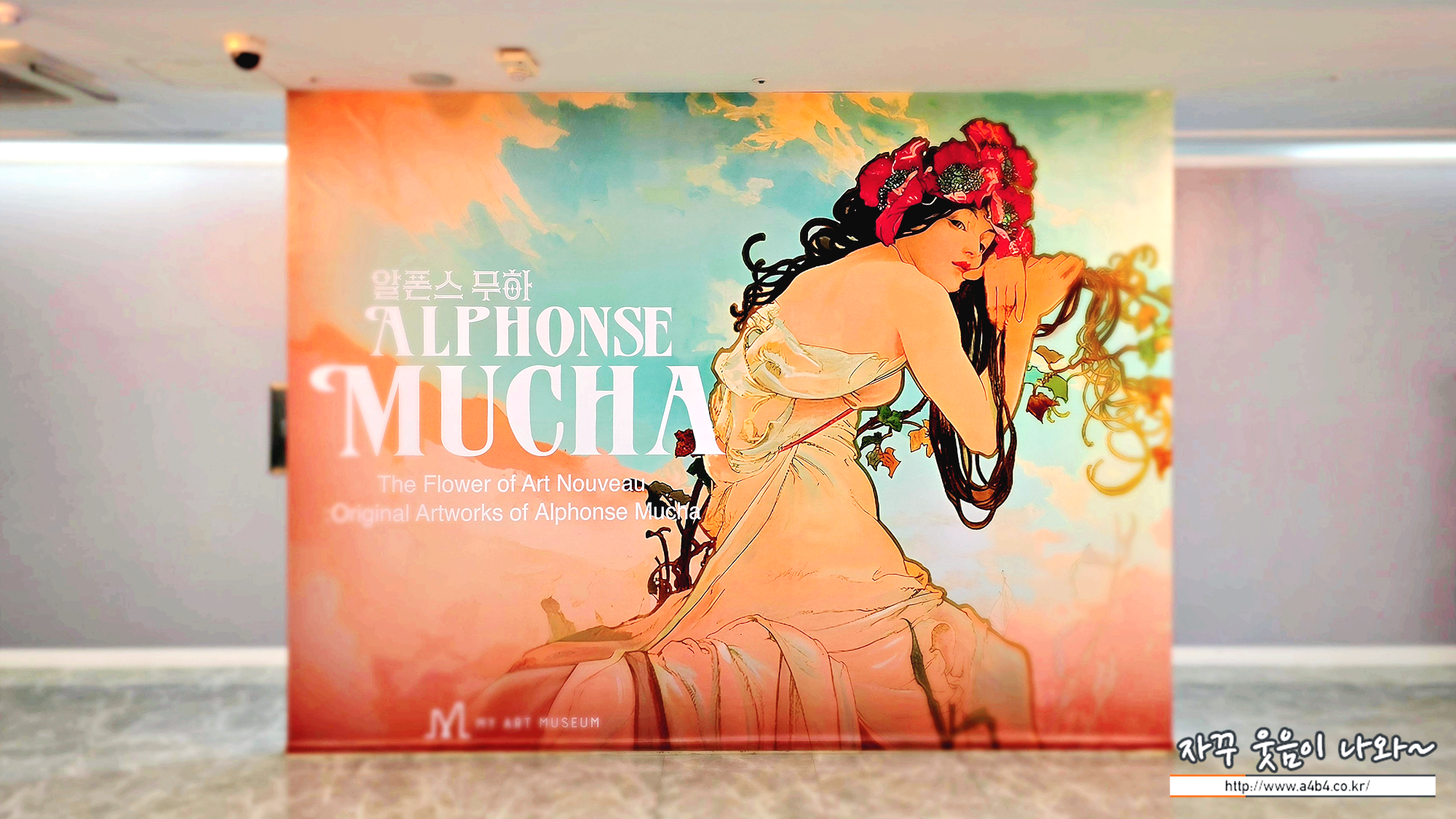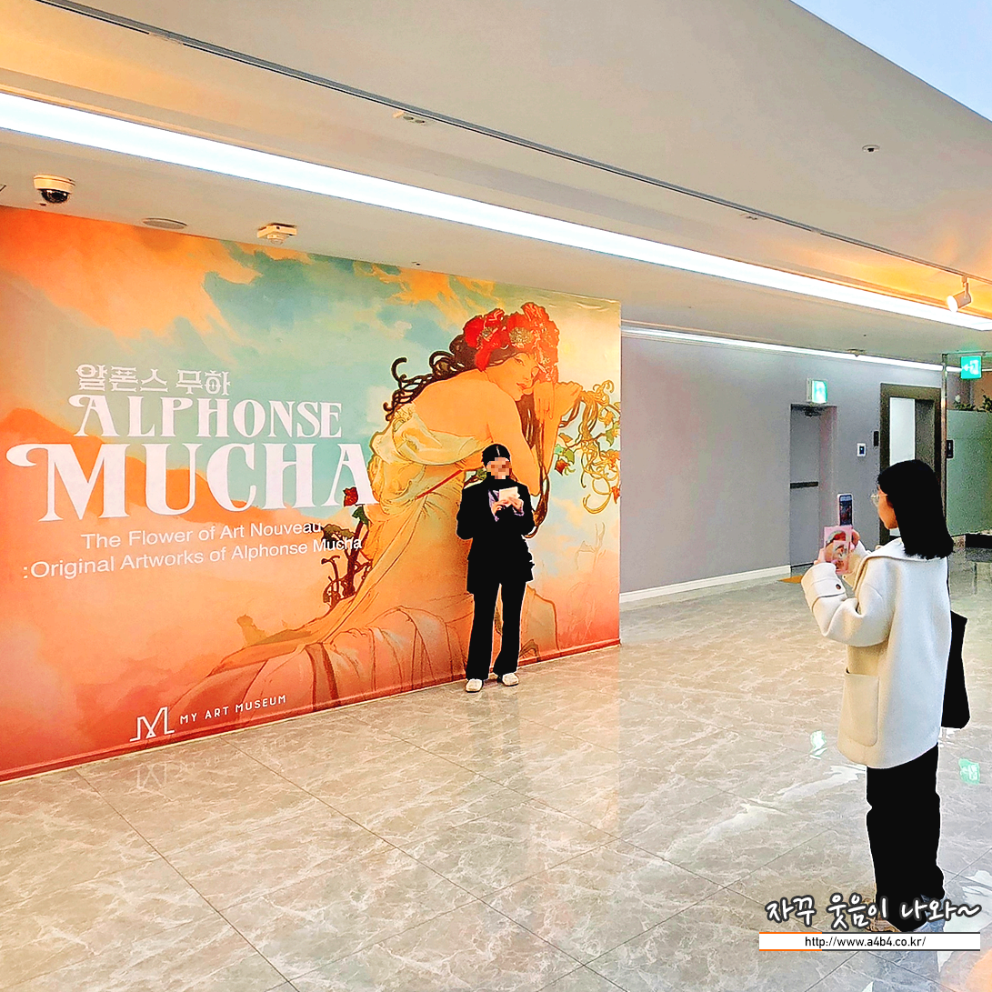이번 전시회가 열리고 있는 마이아트뮤지엄 1층 로비에는 아르누보의 꽃:알폰스 무하 원화전 포토월이 마련되어 있습니다. 그래도 오셨으면 사진찍기 최적의 장소입니다. 조명까지 고려하면... 이곳은 전시회 관람여부와 상관없이 이용이 가능합니다.