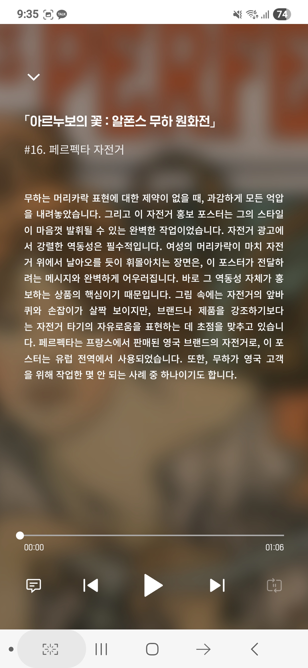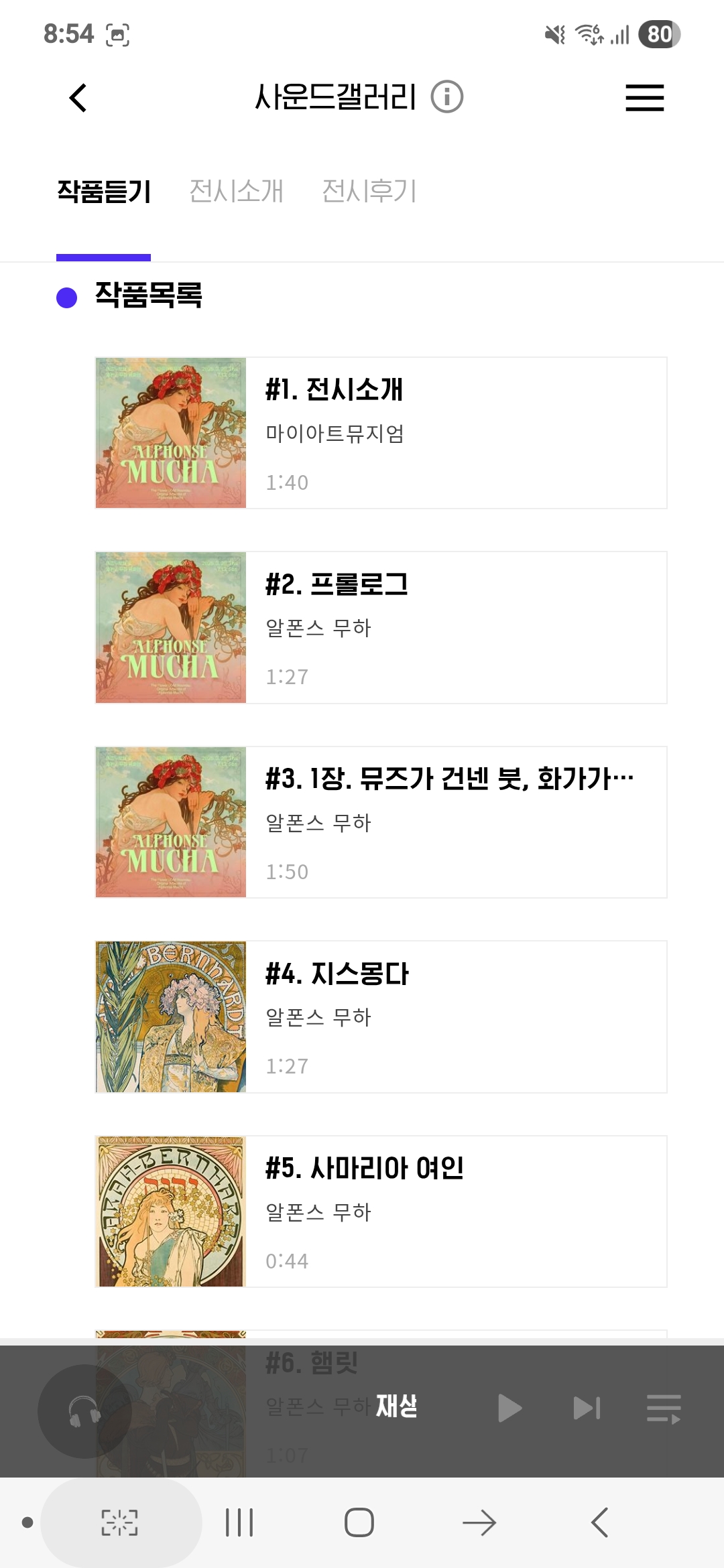 1분 전후의 오디오 파일 30클립이 제공되고 있습니다. 아르누보의 꽃:알폰스 무하 원화전 오디오가이드에서 작품 소개 클립은 약 25개 입니다.