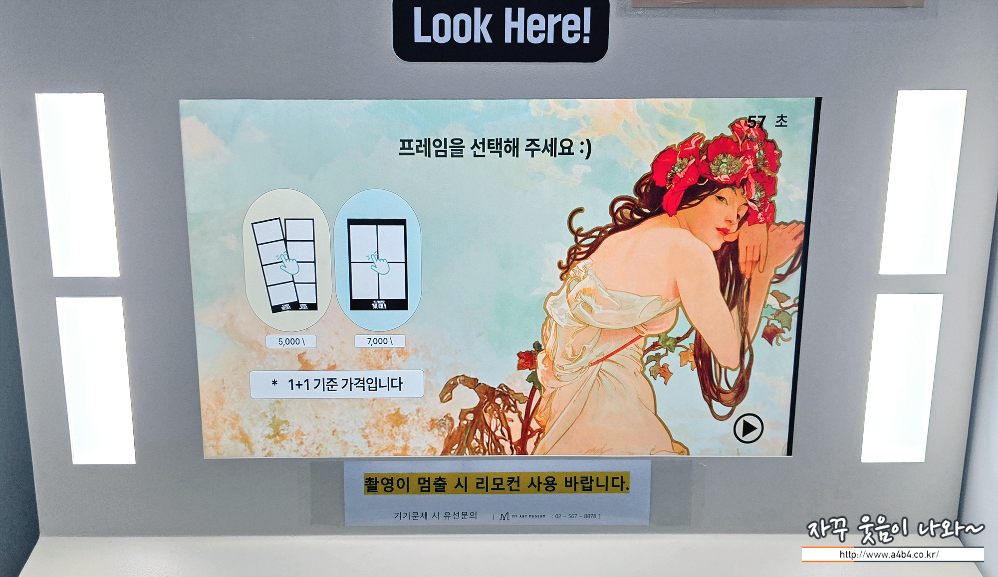 아르누보의 꽃:알폰스 무하 원화전 포토부스 가격은 1+1 기준 작은 사이즈는 5,000원, 큰 사잊 사진은 7,000원 입니다. 관련 프로모션도 있네요.