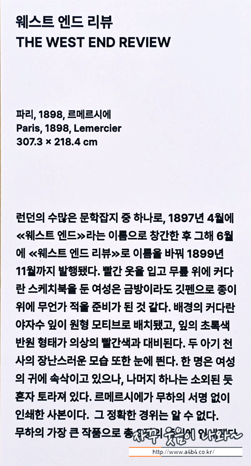 가로 2.1미터 세로 3미터가 넘는 알폰스 무하의 가장 큰 작품입니다. 이 작품이 전시된 공간도 이 작품을 배경으로 사진찍기 좋게 구성되어 있는데요. 이 공간도 역이 이번 아르누보의 꽃:알폰스 무하 원화전시회 포토존 중 하나입니다.