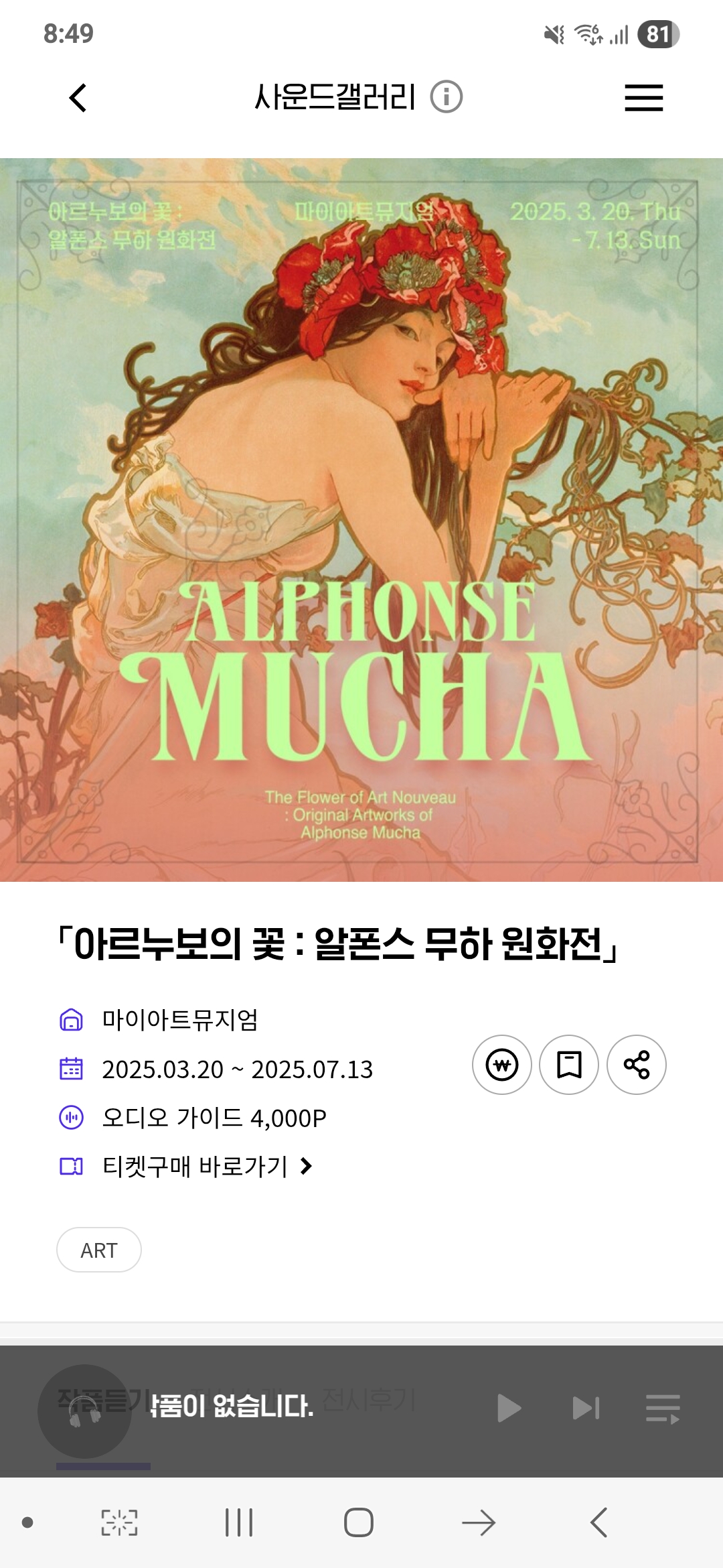 도슨트 시간에 맞추시기 어렵다면 아르누보의 꽃:알폰스 무하 원화전 오디오가이드를 HPoint 앱에서 이용하실 수 있습니다. 다만 무료이용이 아닌 유료 서비스로 제공됩니다. 무하 전시회 오디오가이드 가격은 4,000원으로 역시나 최근 고물가 추세에 맞춰 오디오가이드 이용요금도 높아지고 있네요. 올해 초만해도 다른 전시회들 오디오가이드 요금이 3,000원 정도 했는데.