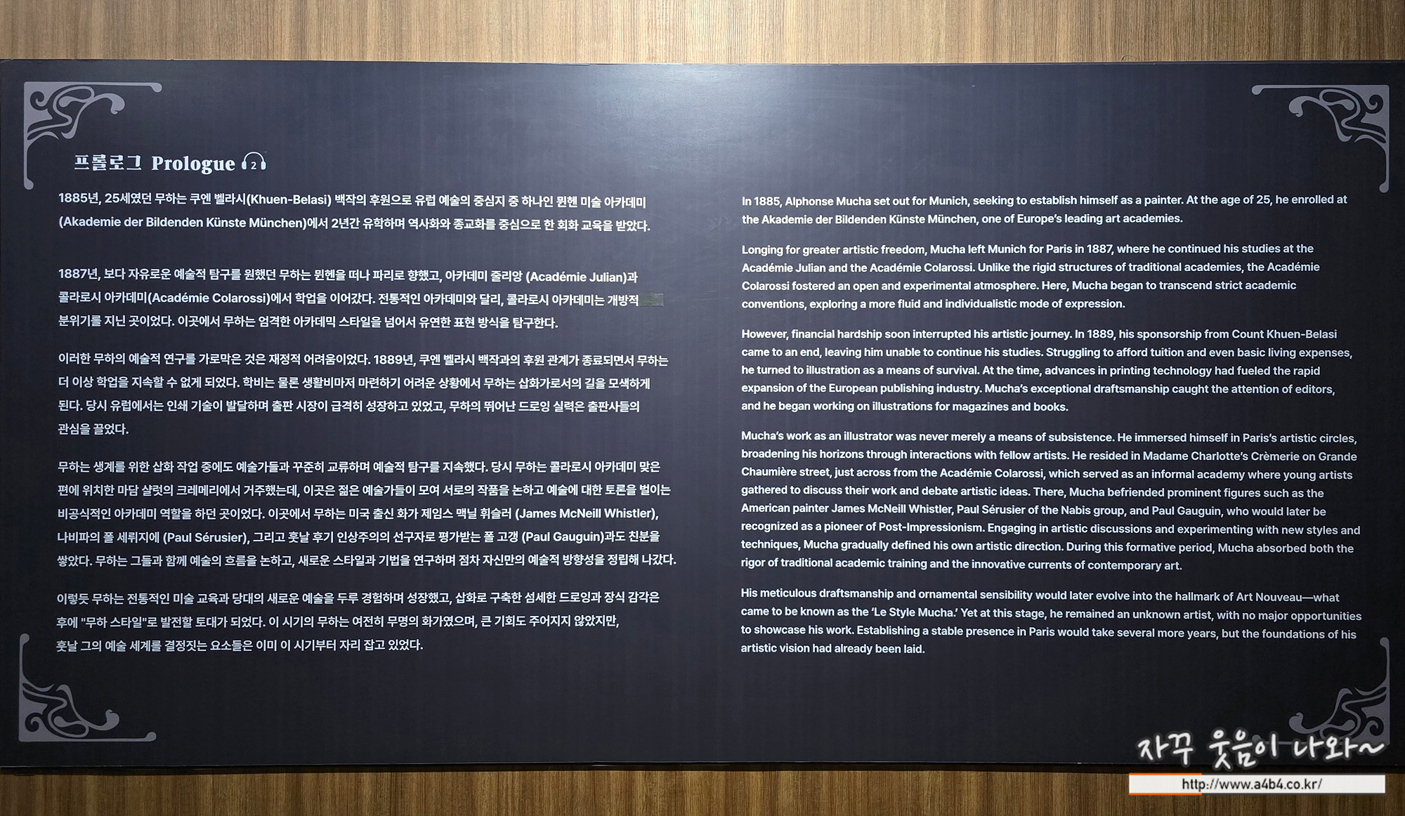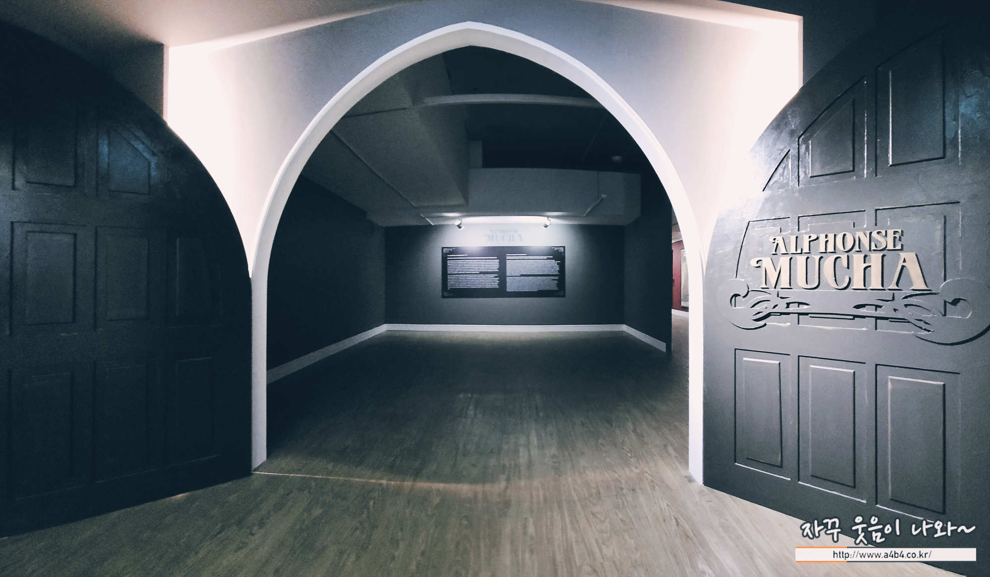 티켓팅하고 들어오면 바로 거대한 문이 보이는데요. Alphonse Mucha 글씨가 양각된 거대한 문을 배경으로 사진 한 장 찍어보세요.