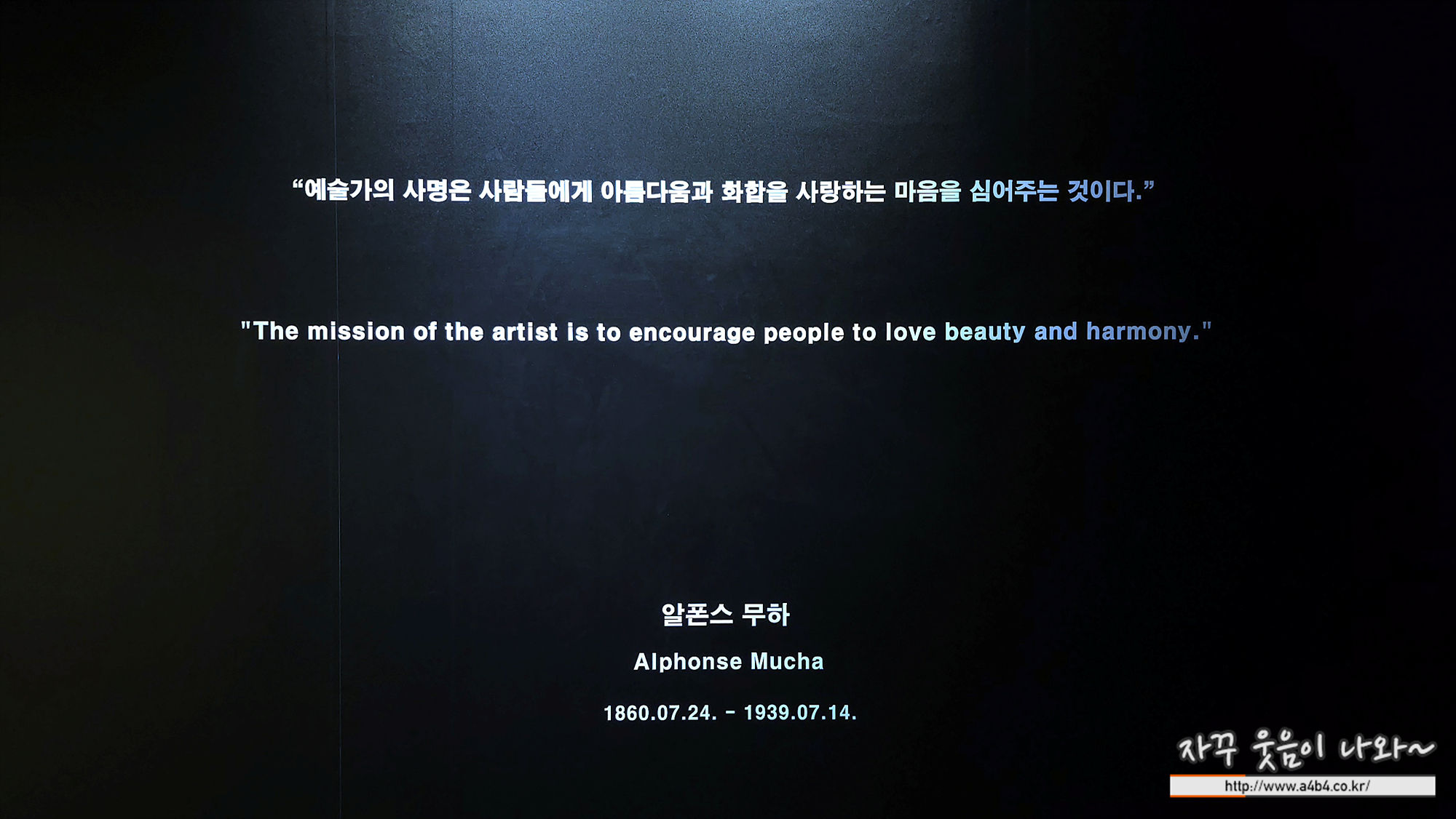 지난 주말 가족과 함께 서울 삼성동 섬유센터 지하 마이아트뮤지엄에서 개관특별전으로 열리고 있는 알폰스 무하전 다녀 왔습니다.전시회는 너무나도 좋았고, 기대 이상의 짜임새 있는 전시 구