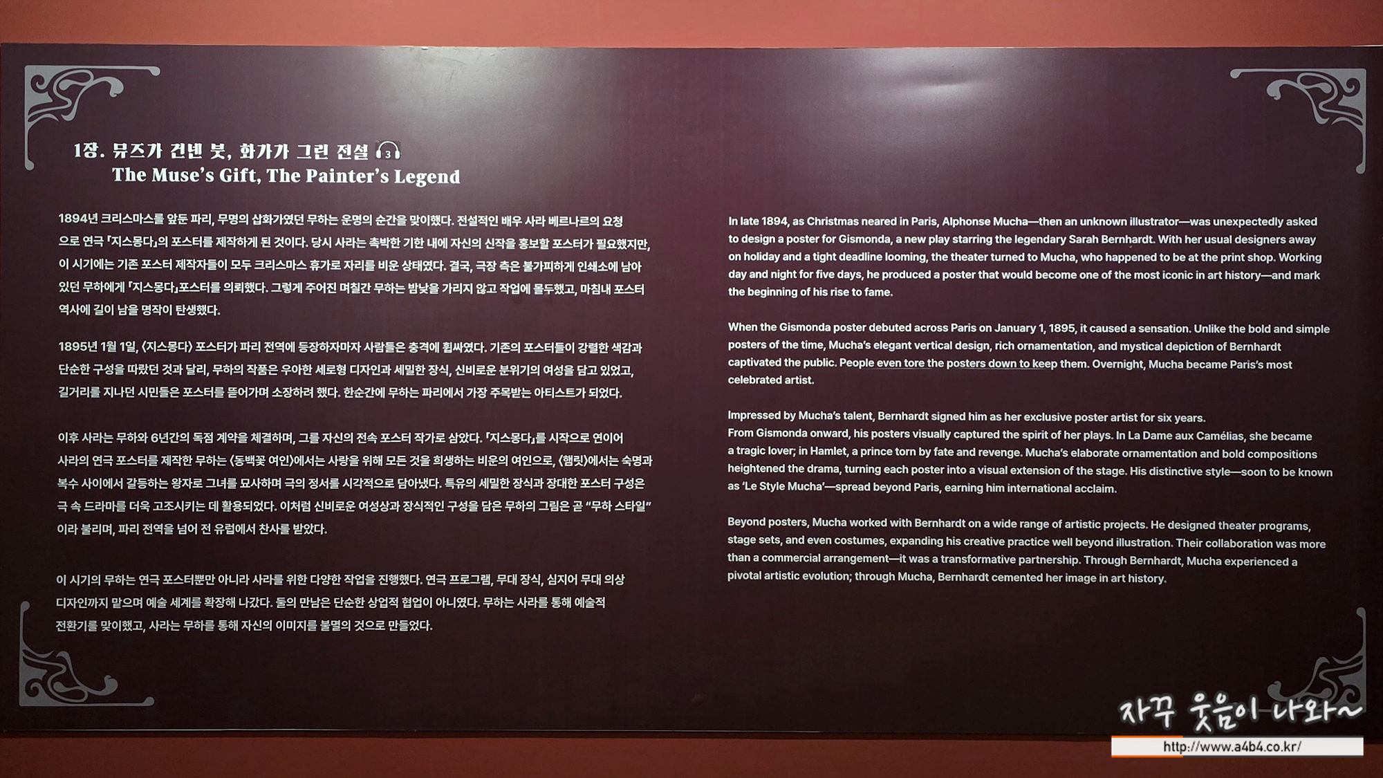 이번 아르누보의 꽃:알폰스 무하 원화전은 노루페인트로 전시장이 시공되었습니다. 노루페인트가 여러 전시회와 작가들을 후원하는데요. 이번 무하 전시회도...