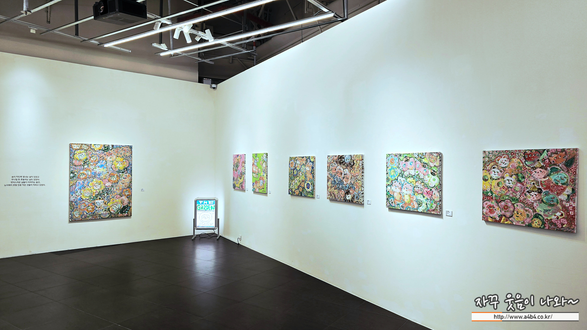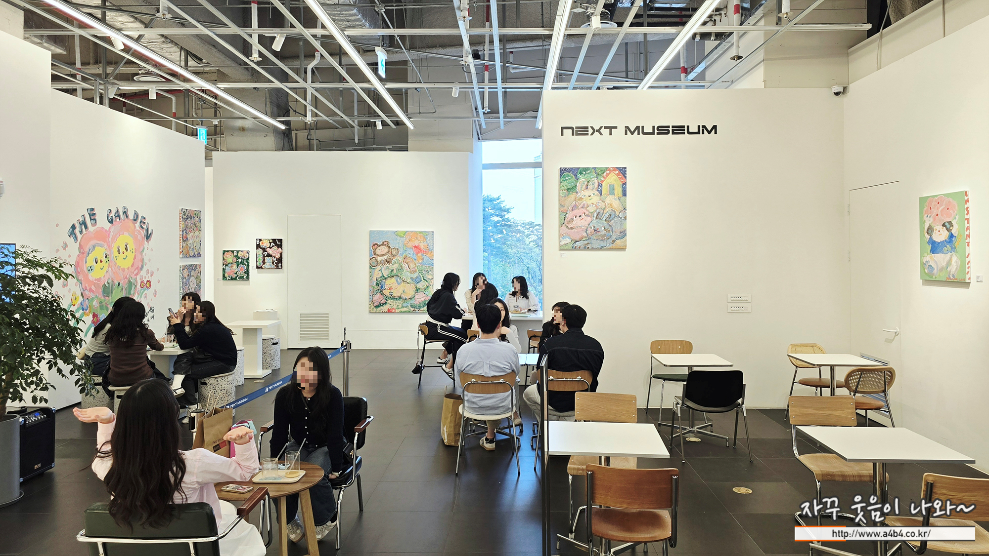 이번 이슬로 개인전 : 정원이 된 시간은 총 3개의 공간에서 진행되는데요. 먼저 넥스트뮤지엄 카페어 전시된 작품소개 먼저 합니다. 벽면에 'The garden' 이름의 벽화가 전시되어 있고요. 커피나 음료 한 잔 하면서 작품 감상의 여유를 느낄 수 있습니다.