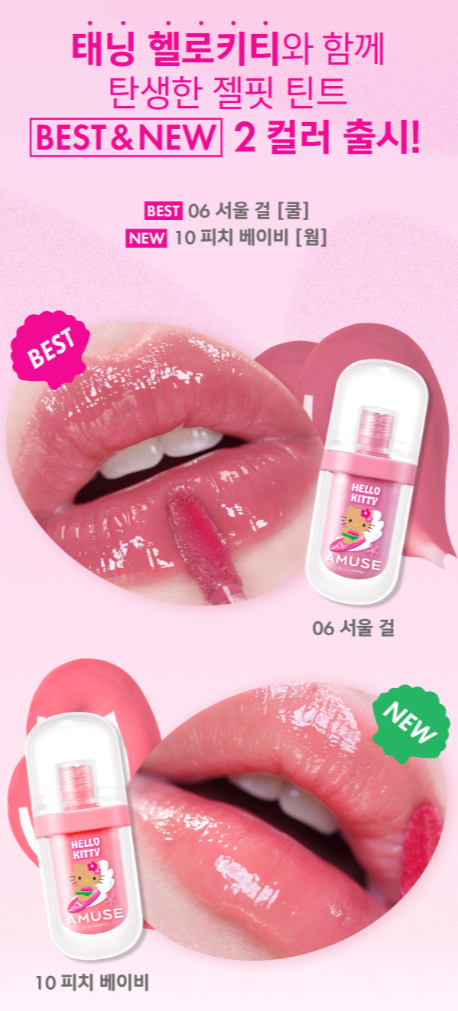 태닝 헬로키티 콜라보 한정 에디션 젤핏 틴트는 쿨에는 06 서울걸, 10 피치 베이비가 포함되어 있네요. 느낌은 젤핏 틴트의 쫀쫀한 느낌이 있네요.