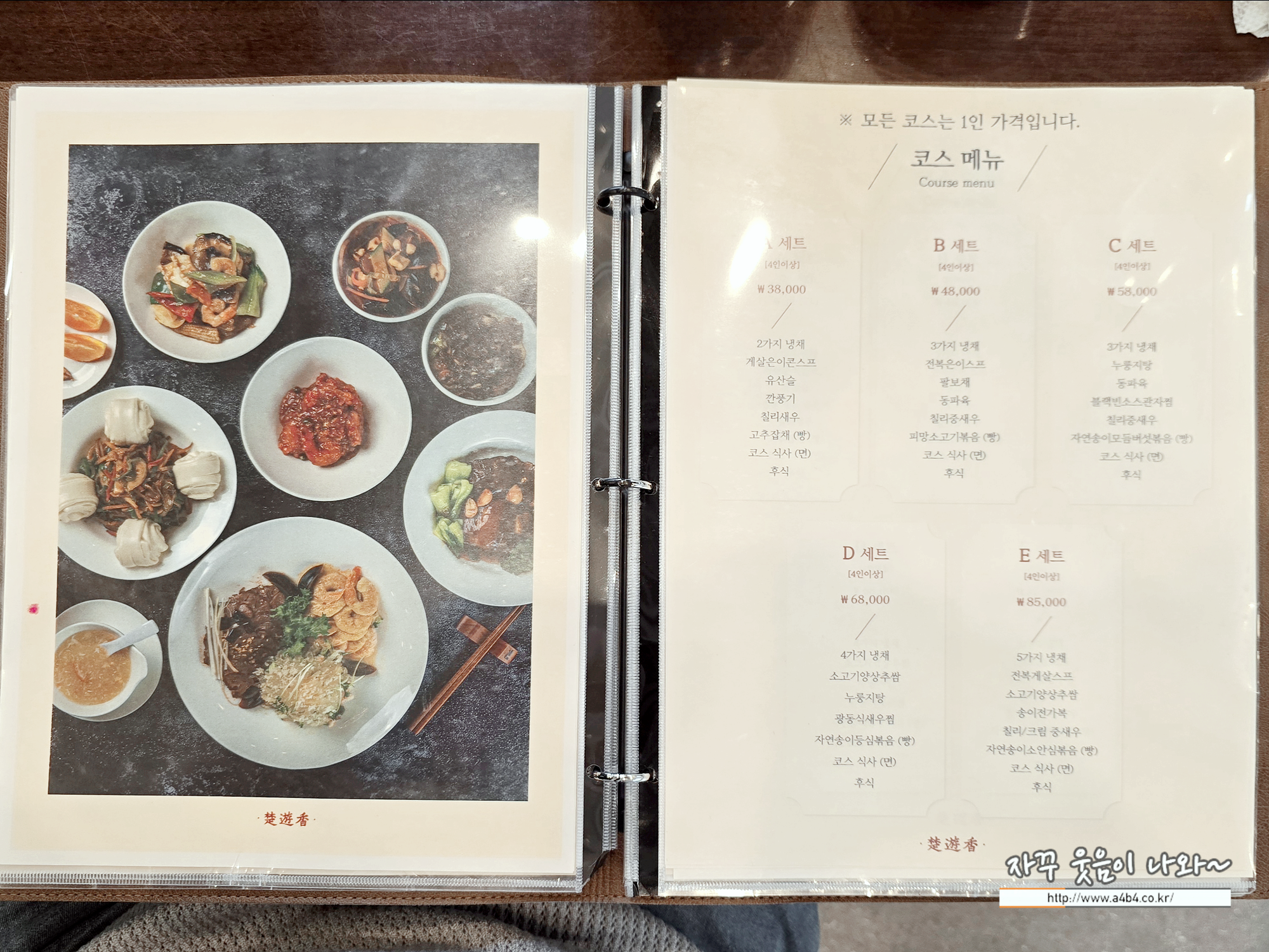 초유향 코스메뉴는 A세트 부터 E세트까지 준비되어 있고요. 세트메뉴 가격은 38,000원 ~ 85,000원