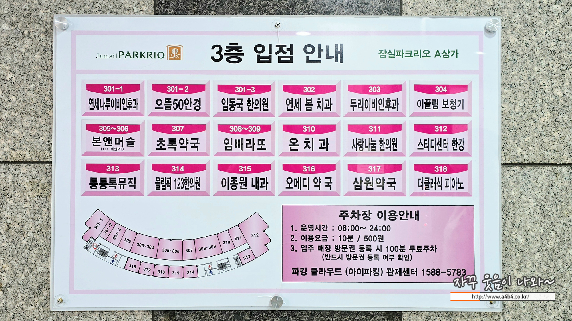 잠실파크리오A상가 병원 3층에는 두 곳의 이비인후과 (두리이비인후과, 연세나루이비인후과)와 이종원 내과, 치과 두 곳 (연세 봄 치과, 온치과)이 있습니다. 파크리오상가 주차장 및 주차요금은 글 하단에서 설명합니다.