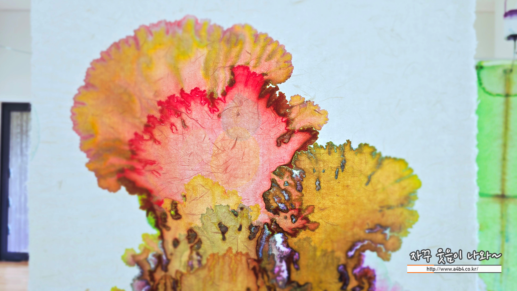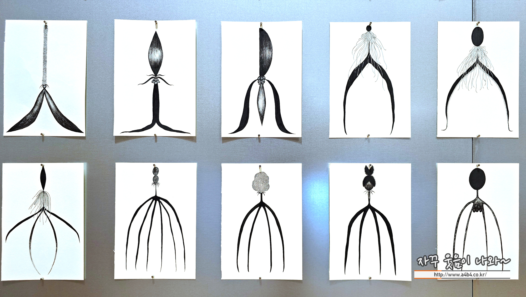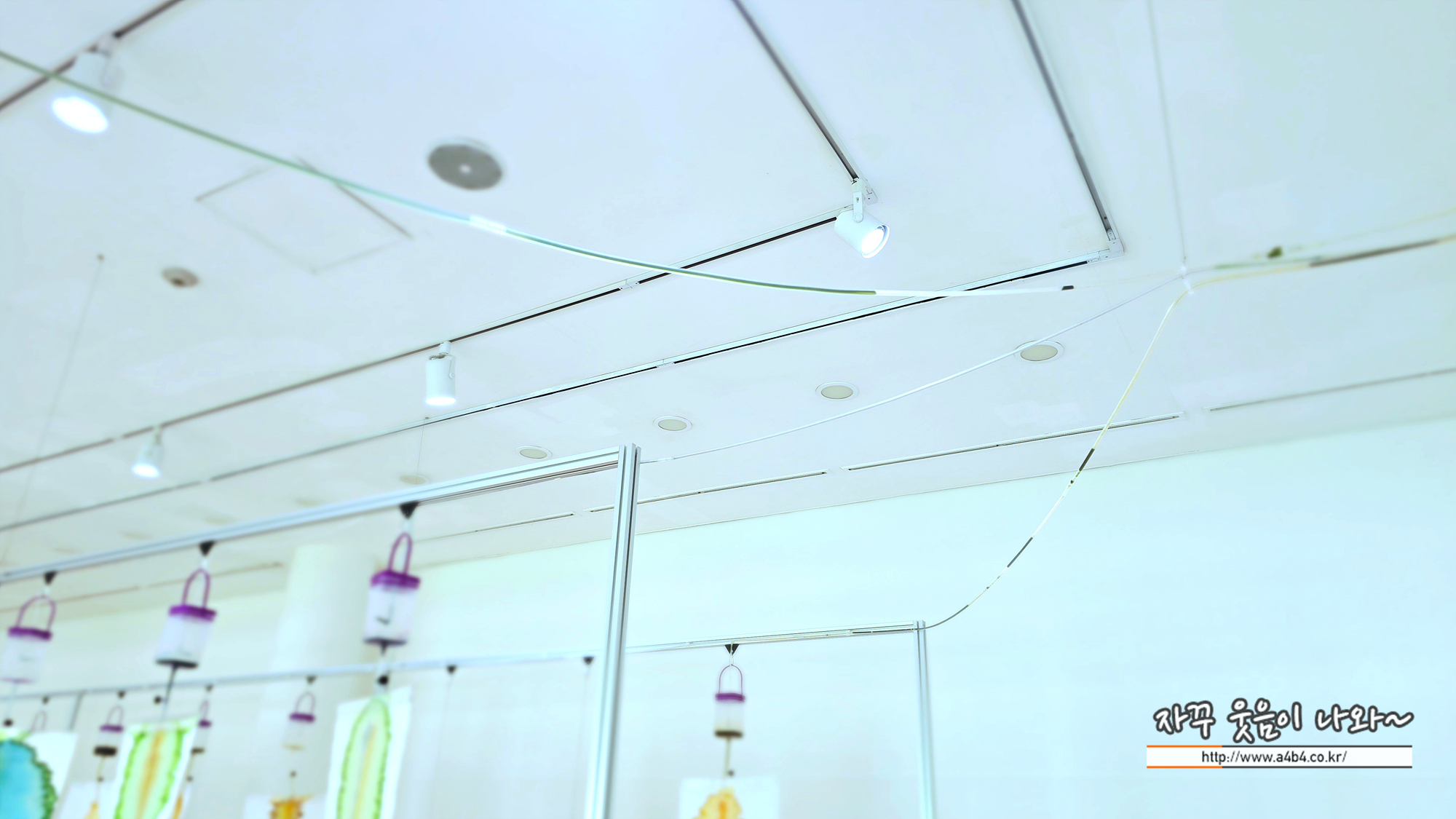 작품위를 자세히 보면 각각의 한지위에 링같이 플라스틱 통과 관이 연결되어 있습니다.