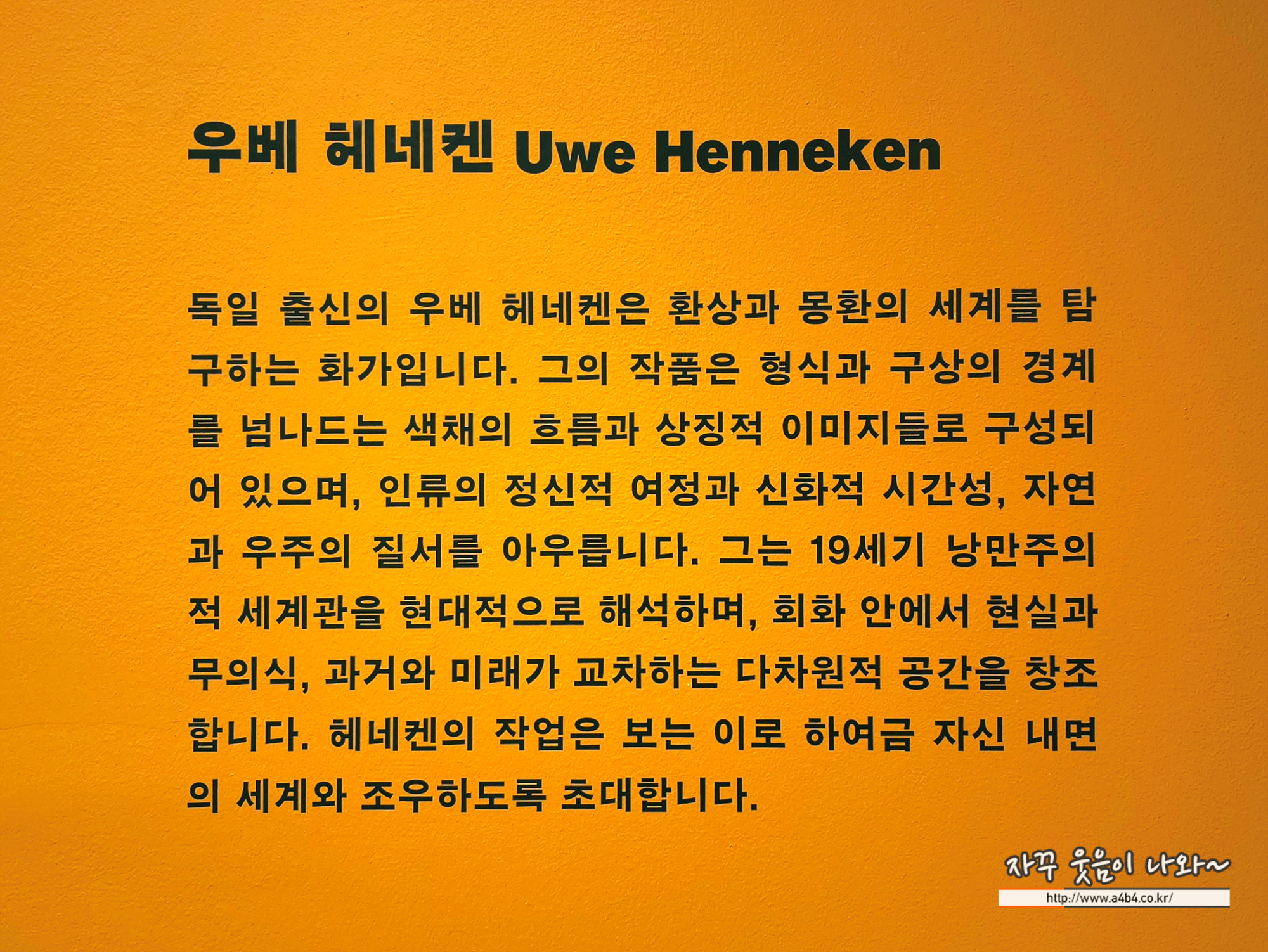 독일 출신의 우베 헤네켄은 환상과 몽환의 세계를 탐구하는 화가입니다. 그의 작품은 형식과 구상의 경계를 넘나드는 색채의 흐름과 상징적 이미지들로 구성되어 있으며, 인류의 정신적 여정과 신화적 시간성, 자연과 우주의 질서를 아우릅니다. 그는 19세기 낭만주의적 세계관을 현대적으로 해석하며, 회화 안에서 현실과 무의식, 과거와 미래가 교차하는 다차원적 공간을 창조합니다. 헤네켄의 작업은 보는 이로 하여금 자신 내면의 세계와 조우하도록 초대합니다.